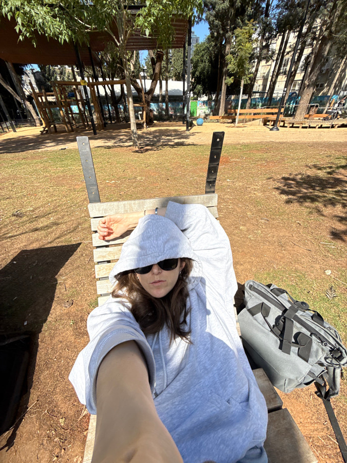 A person is depicted in a high-angle selfie photograph, lying supine on a slatted wooden bench with black metal supports. The individual wears a light gray hooded sweatshirt with the hood pulled over…read more
