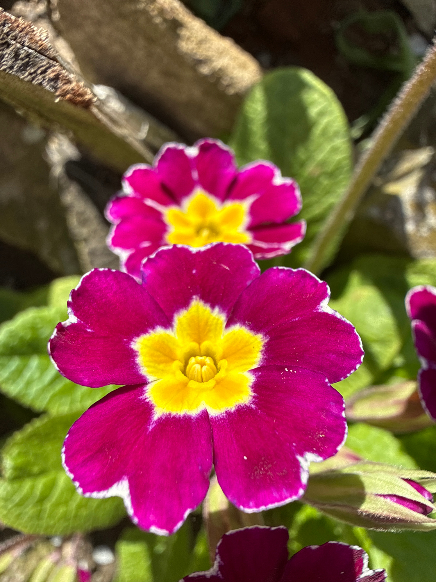 The image features two prominent primrose flowers with magenta petals, edged with white, and yellow centers. A third, partially visible flower is present on the right, along with a closed bud. The flo…read more
