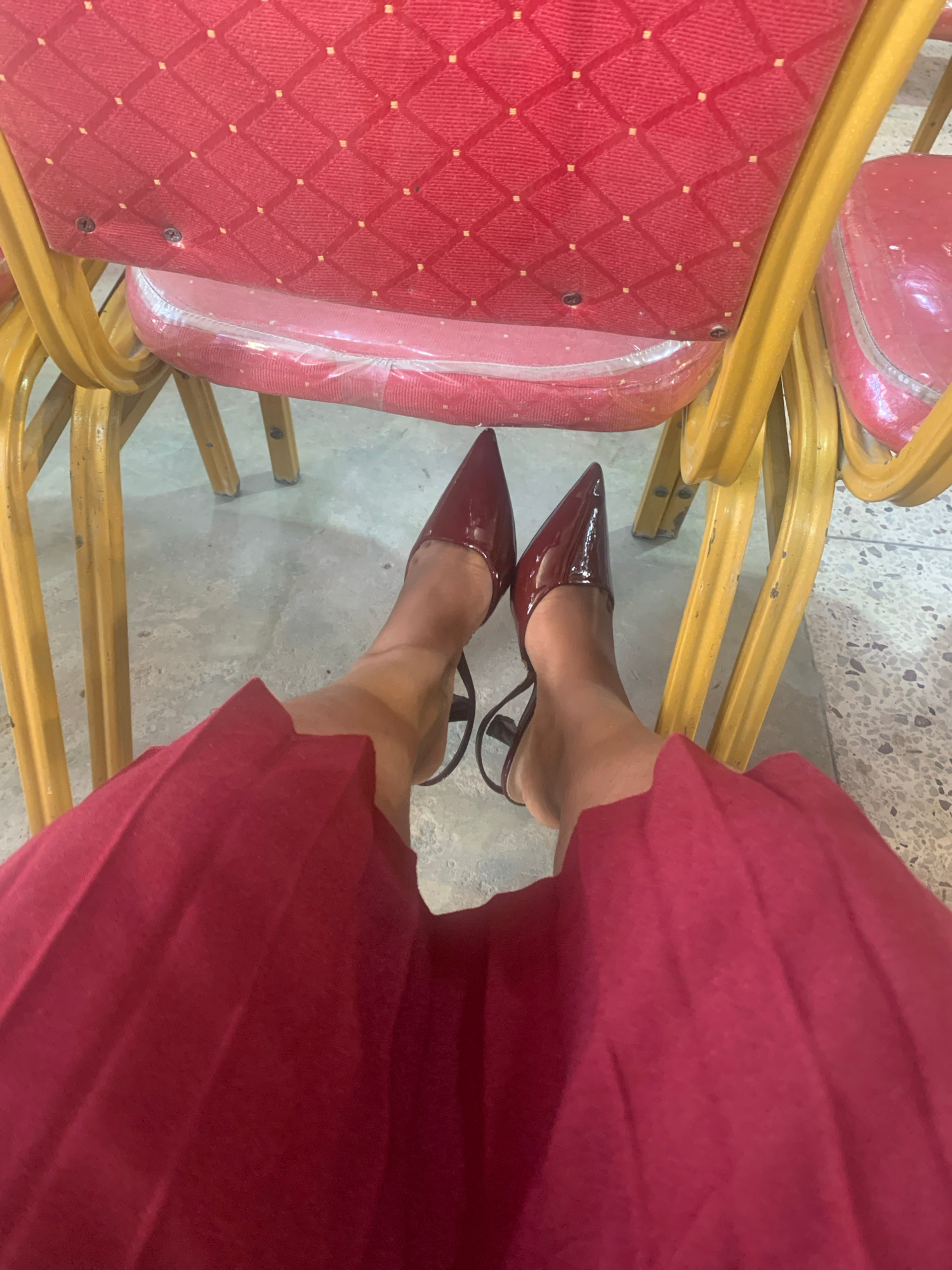 The image shows a pair of feet wearing burgundy patent leather pointed-toe mules, placed on a light gray concrete floor. The person is wearing a matching burgundy dress or skirt. To the left, portions…read more