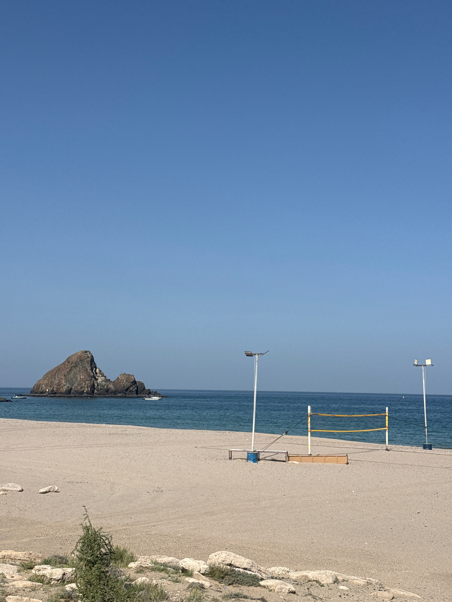 The image depicts a beach scene in Al Aqah, United Arab Emirates. The photograph is taken horizontally, with a clear blue sky occupying a large portion of the upper left quadrant. The right side of th…read more