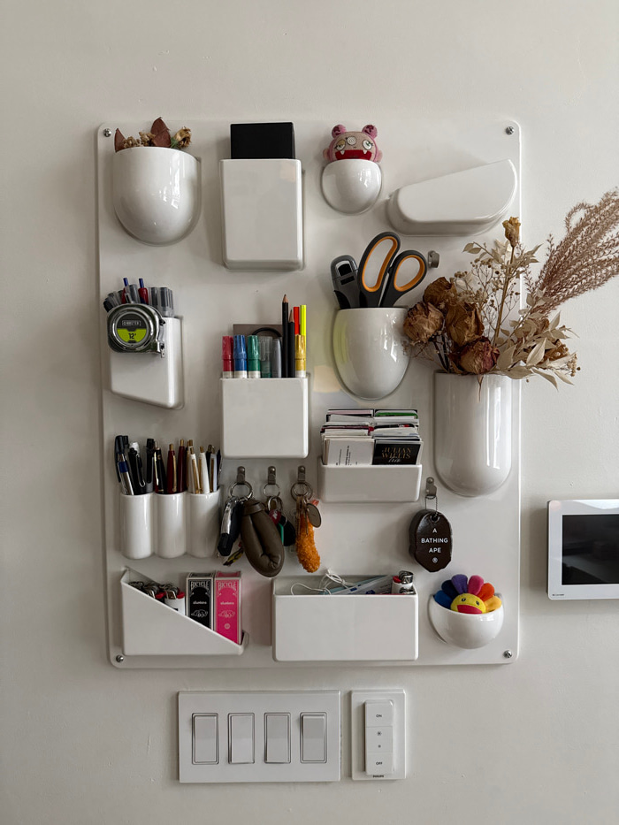 The scene depicts a detailed wall-mounted organization system in an indoor setting, specified to be within the city of New York, United States of America. No individuals are present. The primary subj…read more