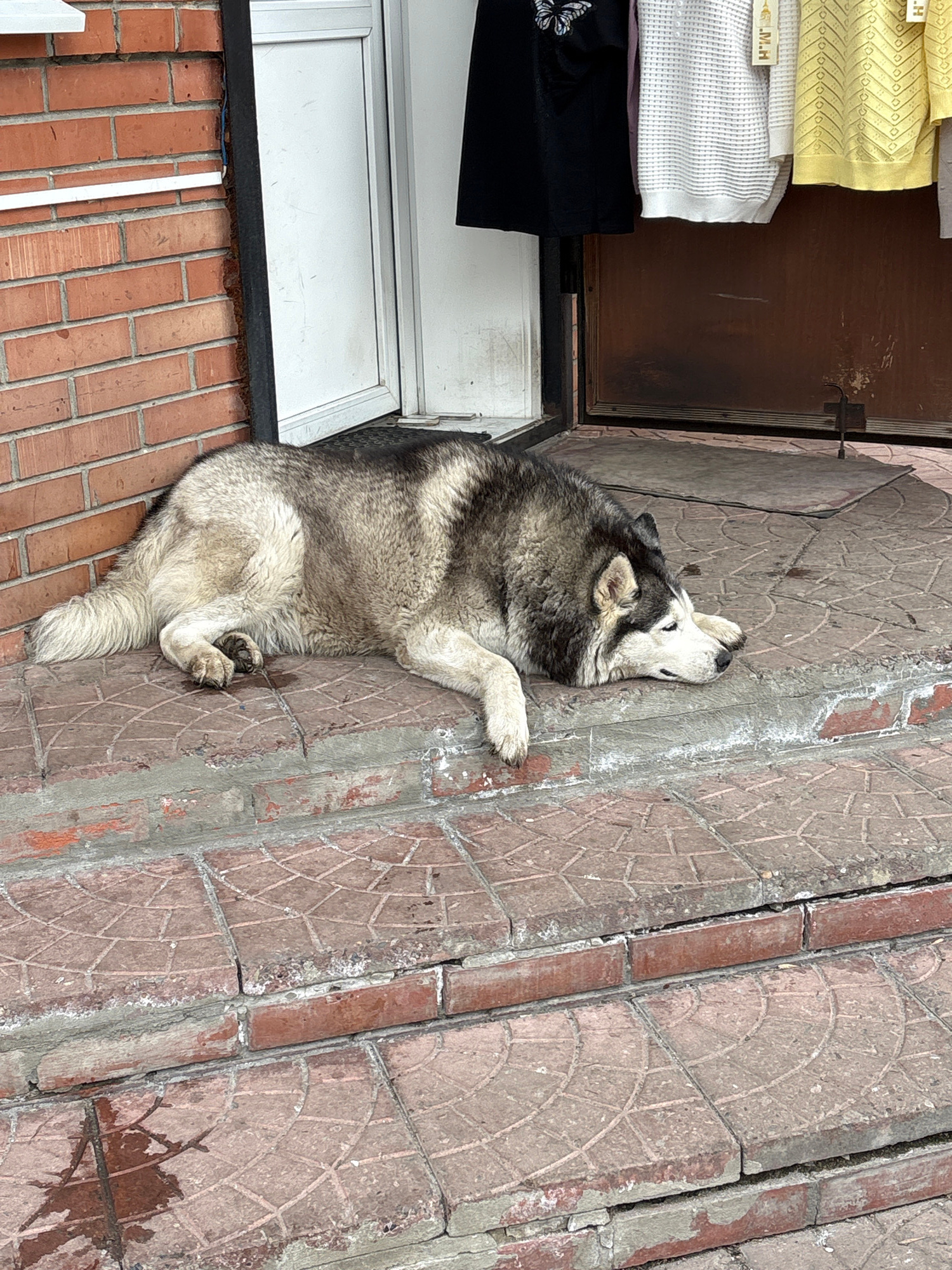 An overhead shot in Ulyanovsk, Russia, depicts a Husky dog lying on a reddish-brown tiled sidewalk. The dog is medium-sized with white and gray fur. It is lying on its side with its head tilted upwardβ¦read more