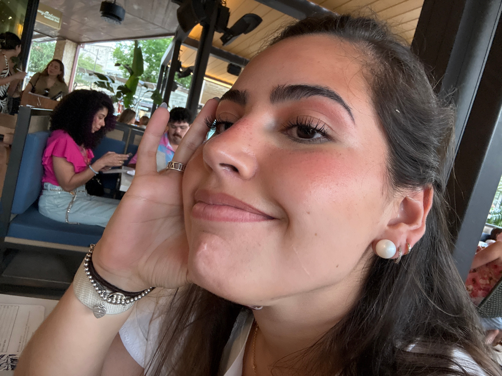 A woman with dark hair is pictured in a close-up selfie. She wears a white pearl earring, a silver bracelet with charms, and a ring with roman numerals. She is smiling softly, with her hand near her f…read more