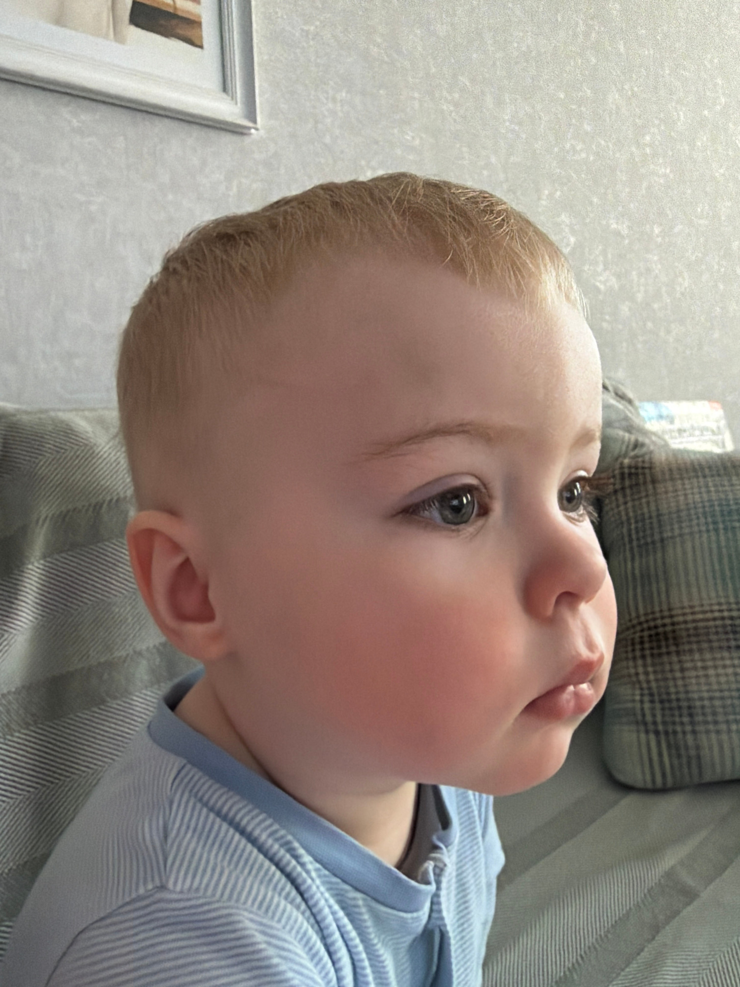 A close-up, medium-angle shot captures a young child, possibly an infant or toddler, lying on what appears to be a patterned couch or bed. The child has fair skin, light blonde hair, and grey eyes. Th…read more