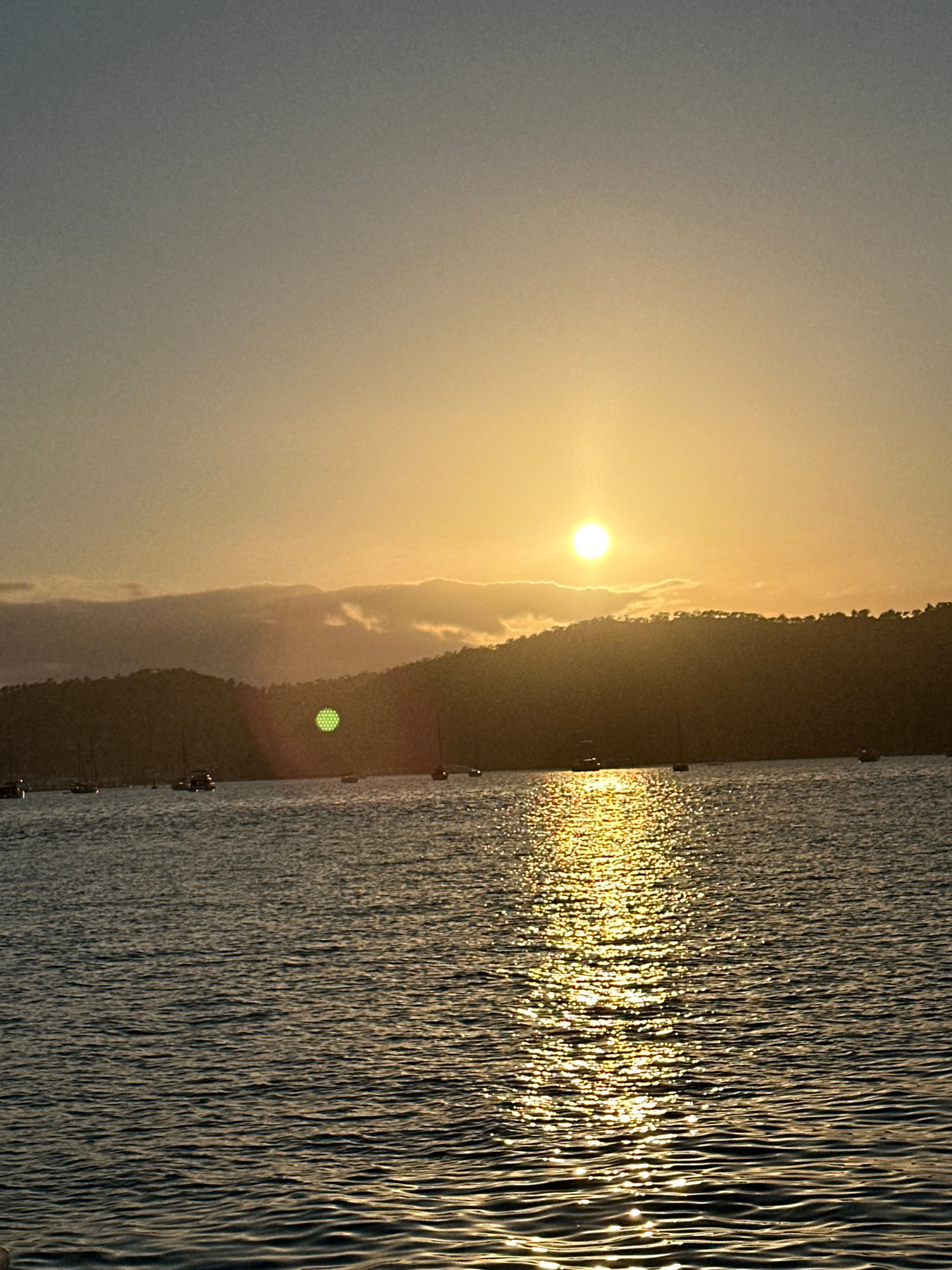 The image shows a sunset over water, possibly the Aegean Sea, in Fethiye, Turkey. The sun is positioned above a dark, hilly landscape. The water surface reflects the sunlight, creating a bright shimme…read more