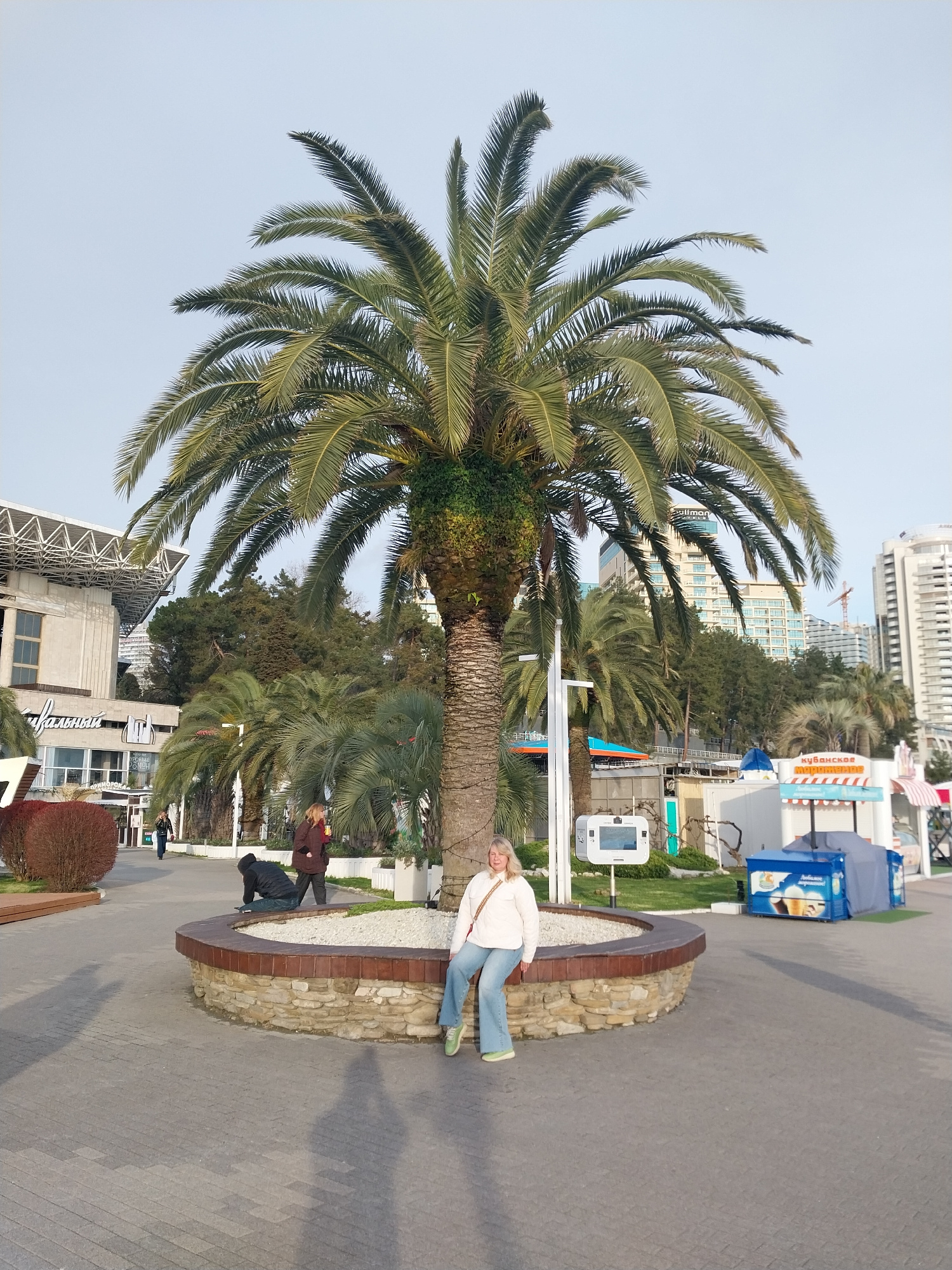 The image captures a public space in Sochi, Russia, featuring a large palm tree as the primary focal point. A woman in a white jacket and blue jeans is sitting on a curved, brick-edged planter at the…read more