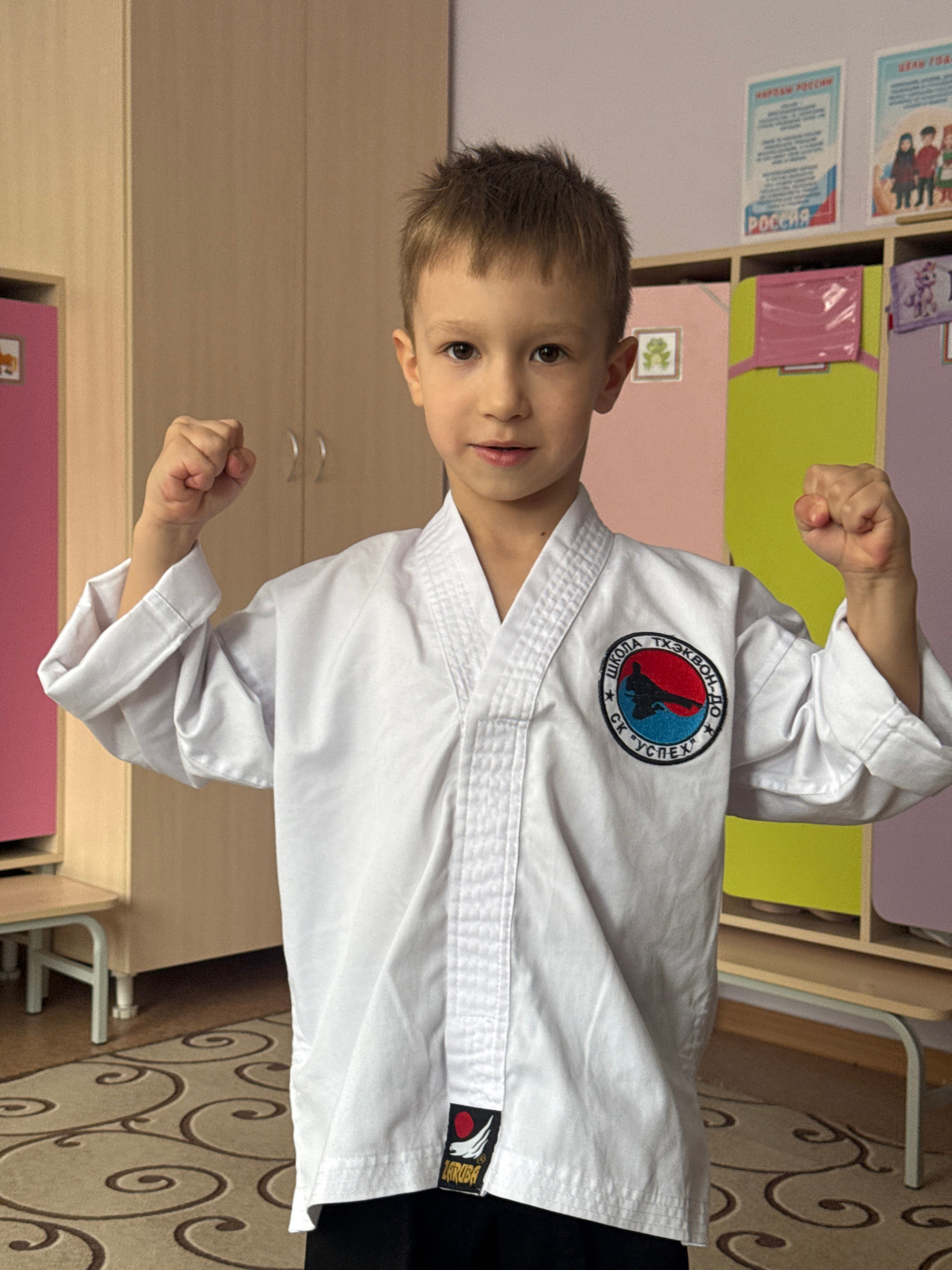 A young boy, approximately 6-8 years old, is depicted indoors, looking directly at the camera with a determined and confident expression. He has short, light brown hair and dark eyes. He is dressed in…read more