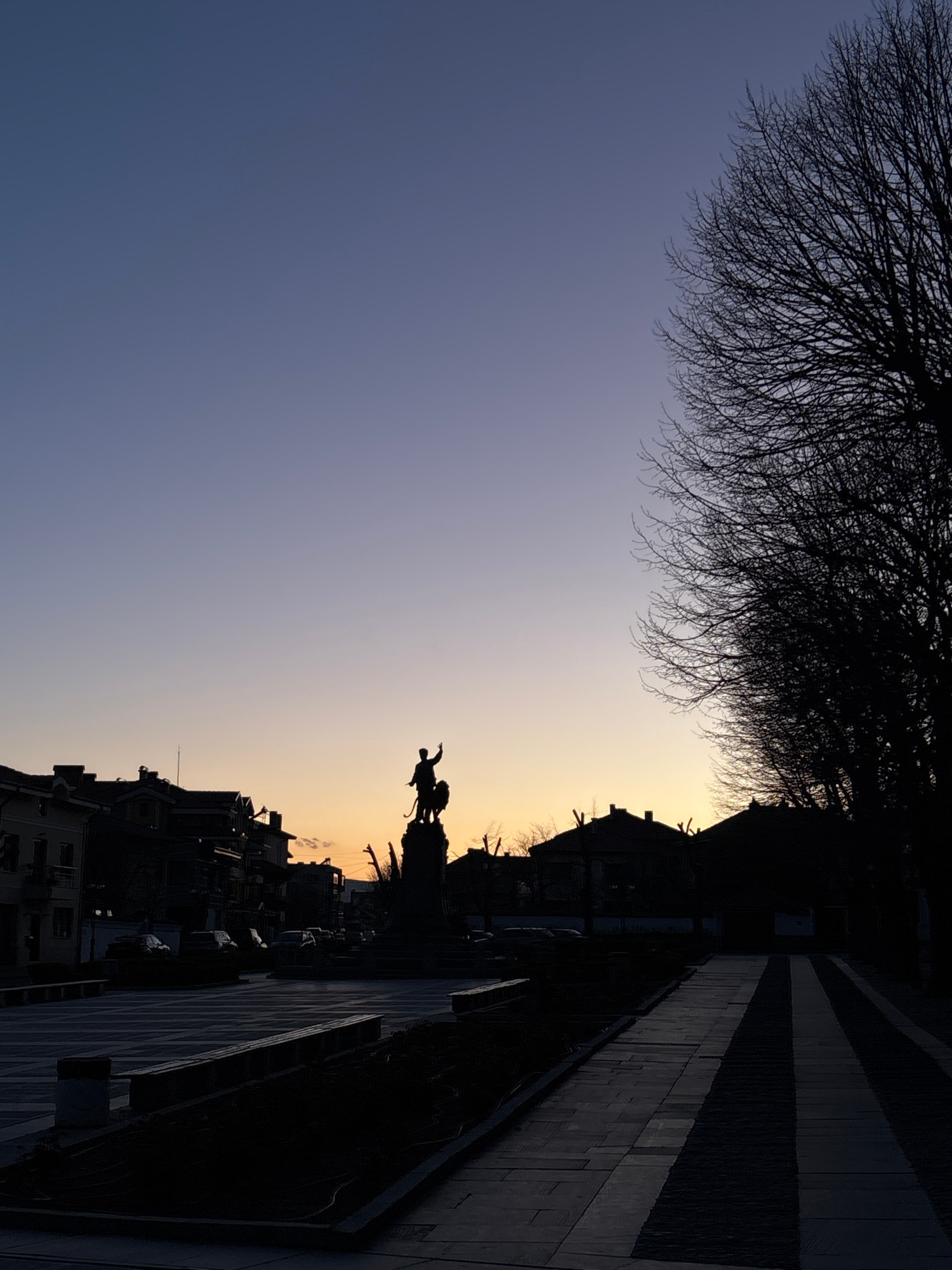 The image shows a silhouette of a statue of Vasil Levski on horseback in Karlovo, Bulgaria. The statue is framed by a gradient sky transitioning from blue to yellow, indicating a sunset or sunrise. In…read more