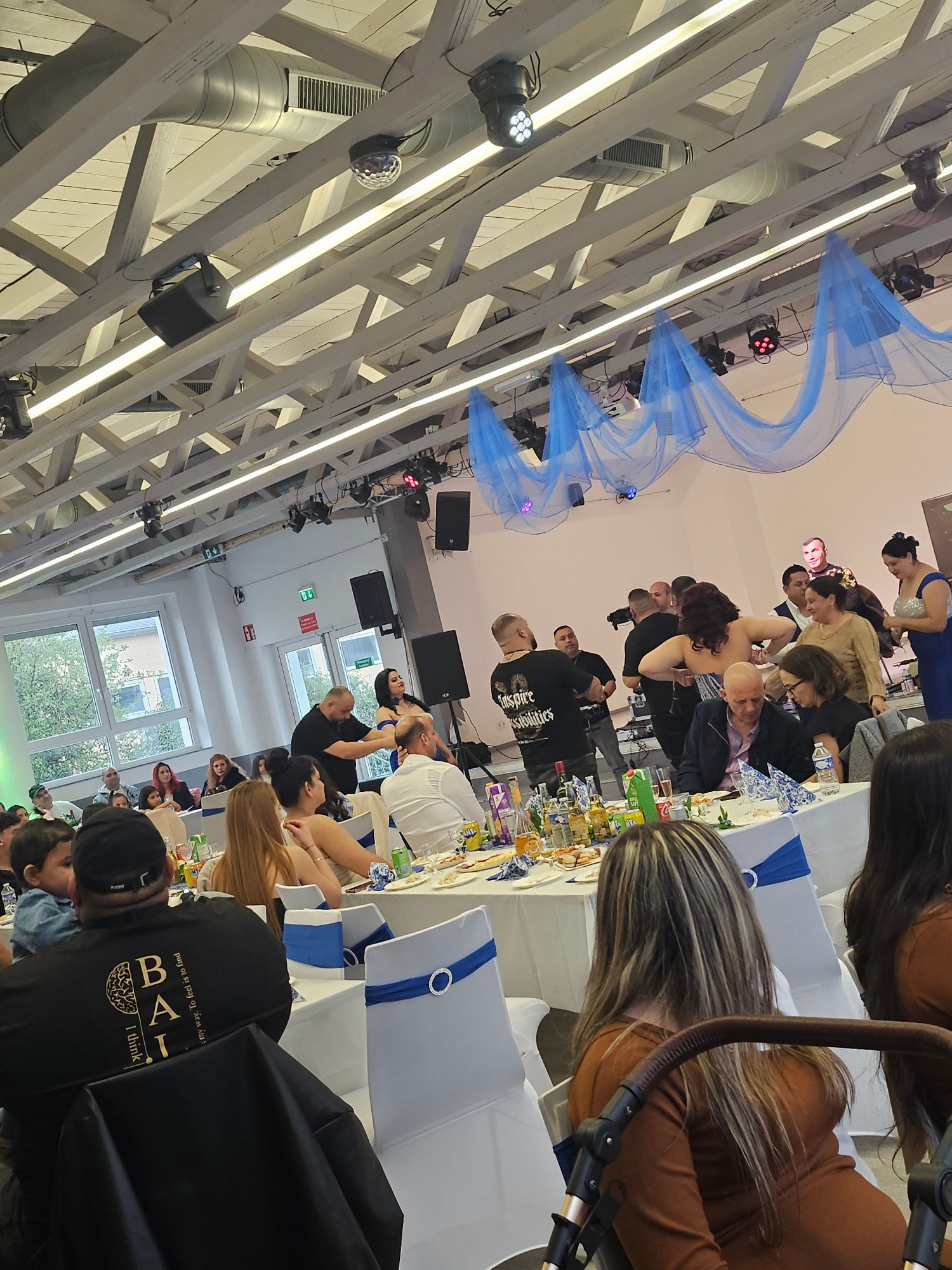 The image captures a banquet-style indoor event in Trier, Germany. The location features a high ceiling with white, lattice-style structural beams adorned with blue tulle decorations and mounted light…read more