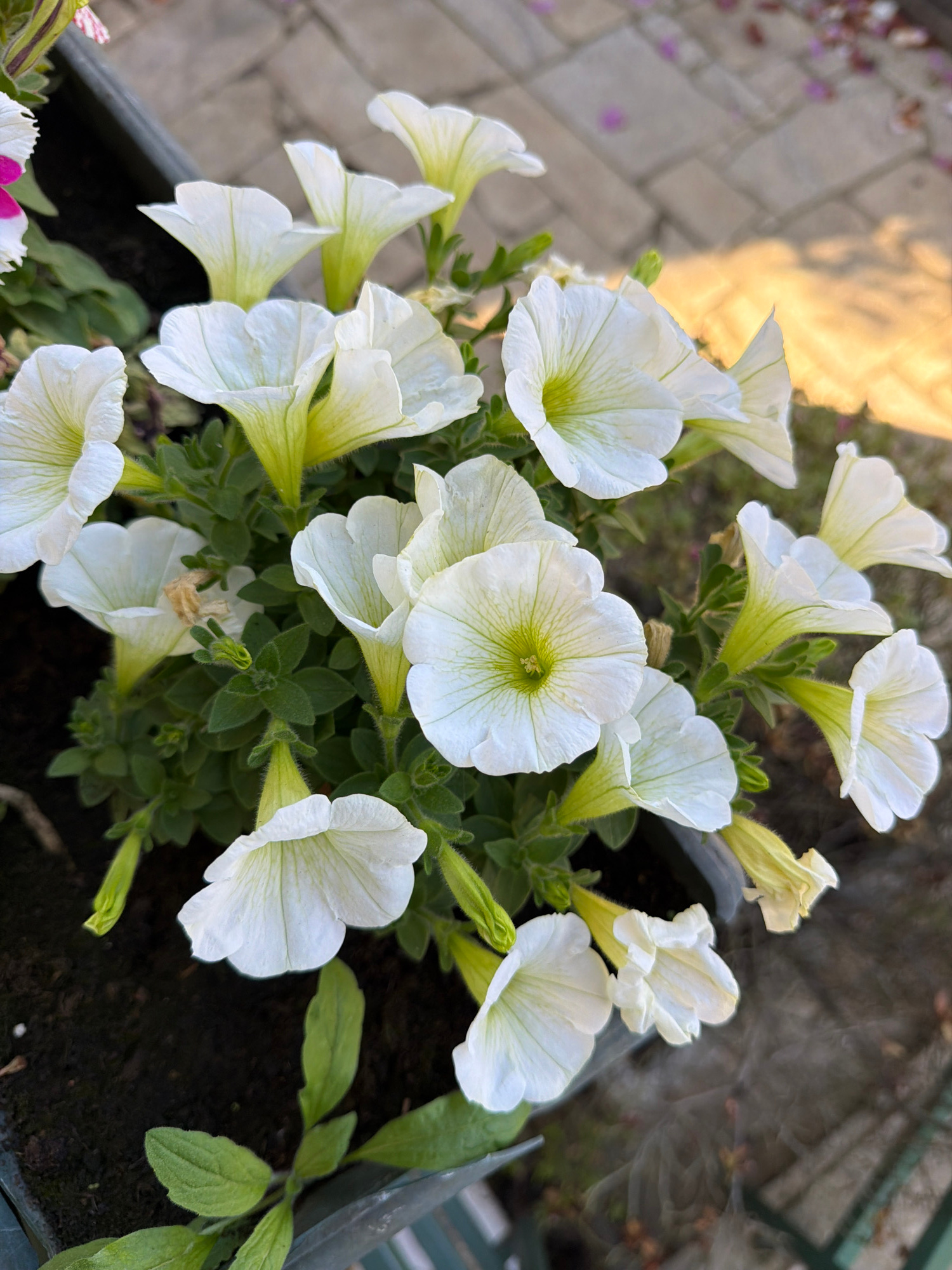 The image shows a close-up of a cluster of white petunia flowers in a planter. The flowers have a distinct funnel shape with delicate white petals and a light green center. The flowers are densely pac…read more