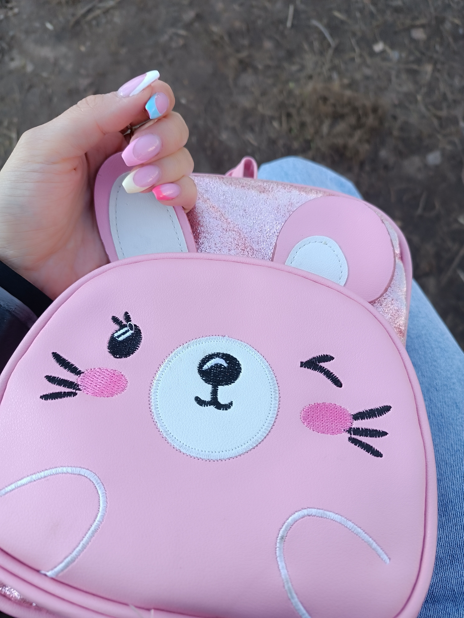 The image shows a person holding a pink, cartoon-like bunny backpack. The backpack has a round, white patch for the face with embroidered details for the eyes, nose, mouth, cheeks, and whiskers. The eβ¦read more