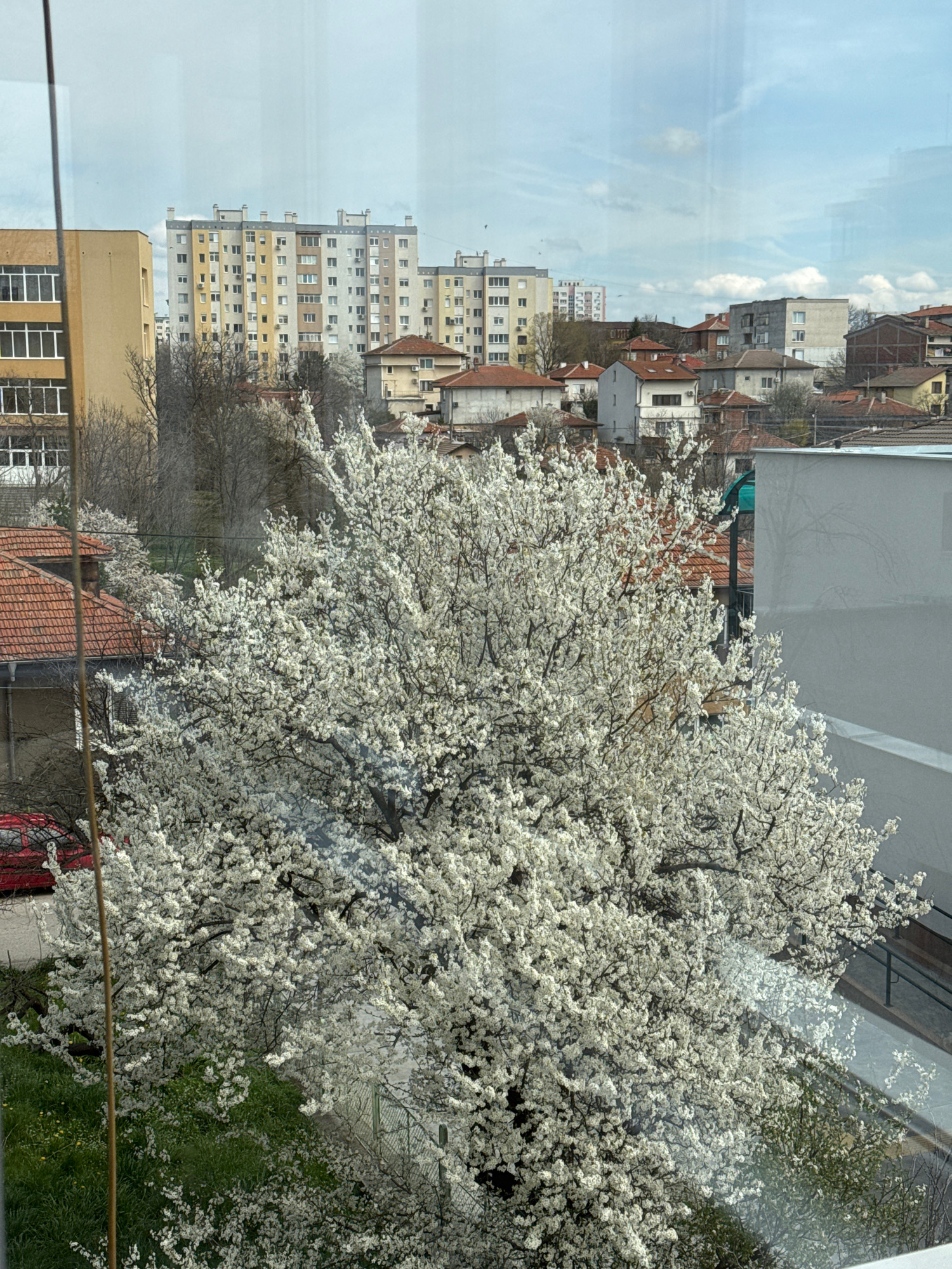 The image depicts a view from a window, likely in a building in Haskovo, Bulgaria. Through the glass, the scene presents two distinct elements: a cityscape reflection and a foreground filled with a fl…read more