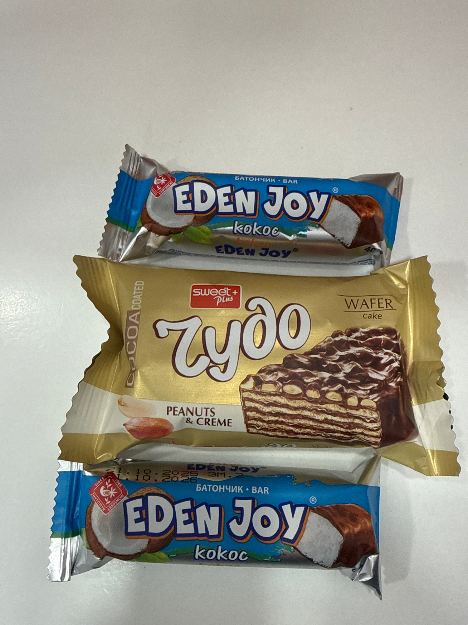 The image shows three individually wrapped confectionery items placed on a white surface. Two of the items, positioned on the left and right, are "Eden Joy" coconut bars, wrapped in a blue and silver…read more