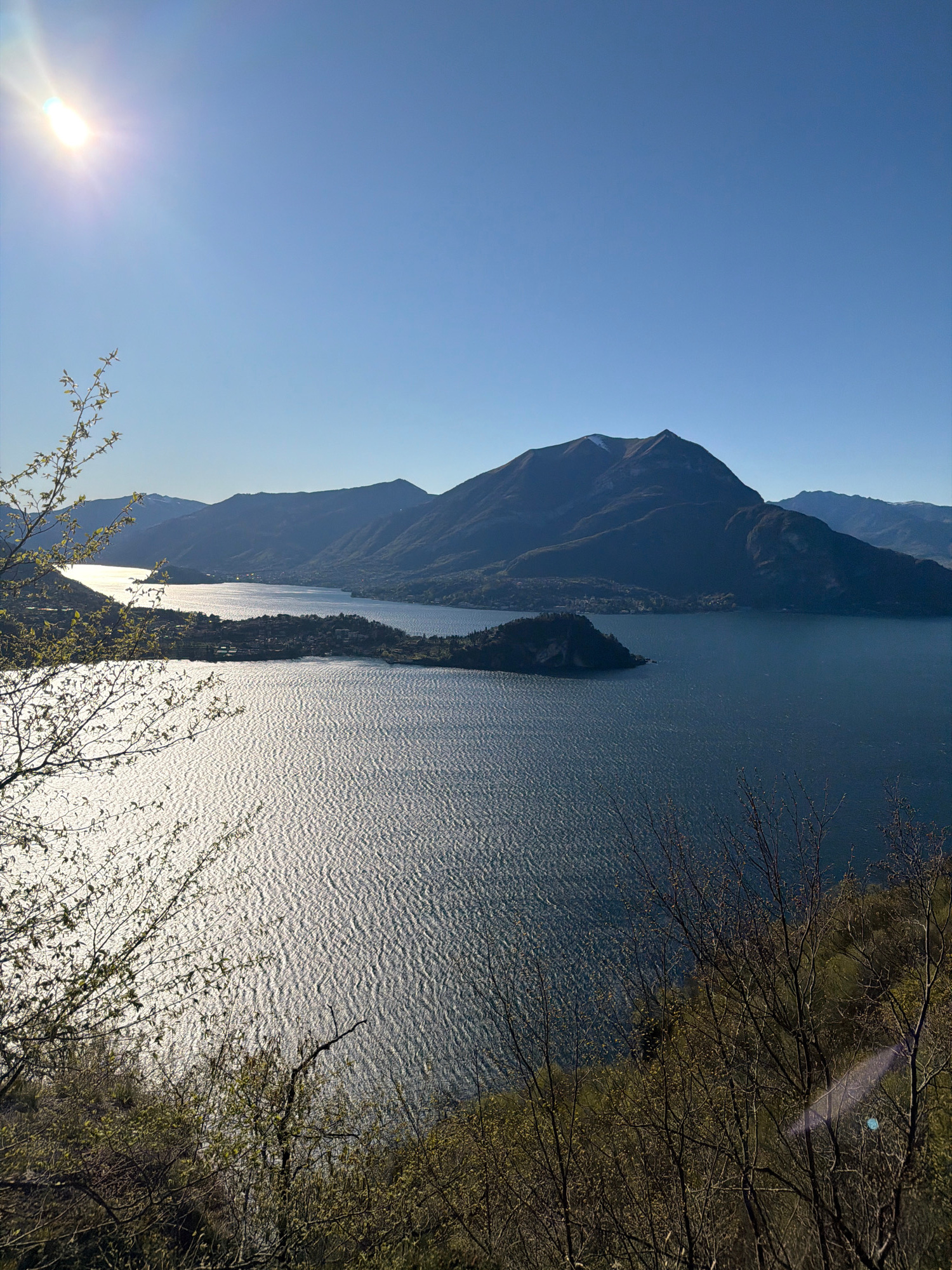 The image presents a landscape scene featuring a body of water surrounded by mountains, likely a lake in the Pino, Italy area. The water surface reflects sunlight, creating a shimmering effect. Mounta…read more