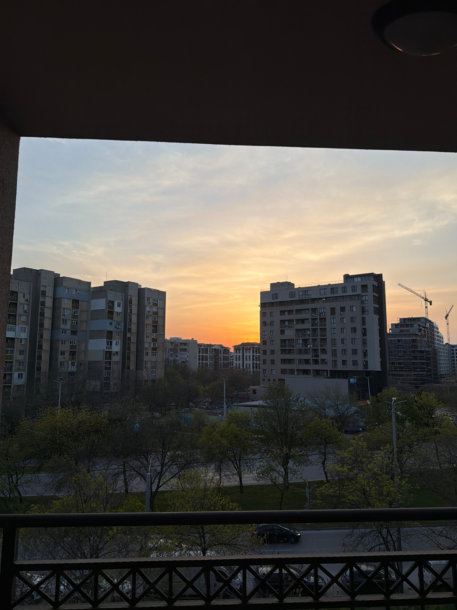 The image shows a view from a balcony in Plovdiv, Bulgaria, during a sunset. In the foreground is a dark balcony railing and a wall. The background contains several apartment buildings of varying heig…read more