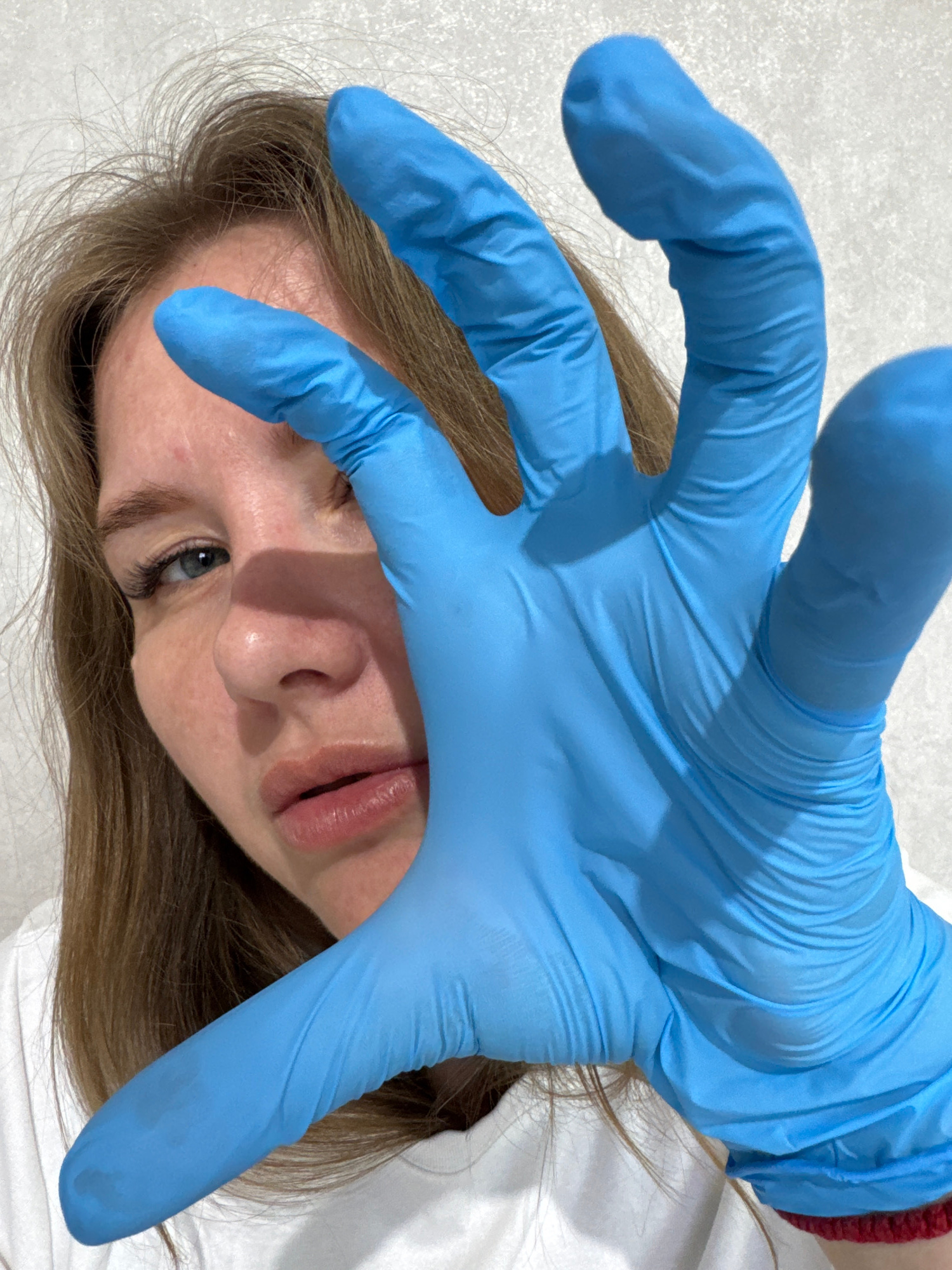 A person lies on a white surface, likely a table or bed, in an indoor setting. The person has light brown hair and fair skin. A blue latex glove covers much of the person's face, obscuring the forehea…read more