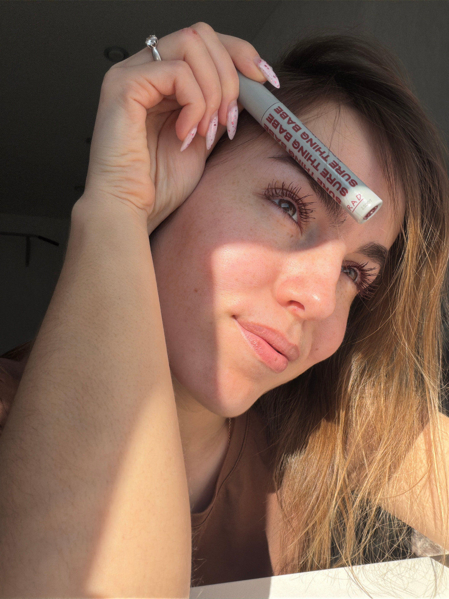 A young woman with fair skin and light brown hair is photographed in a brightly lit environment. She holds a white tube labeled "SURE THING BABE" near her forehead, between her eyebrow and hairline. H…read more