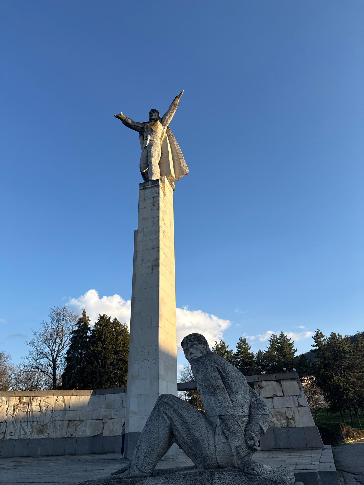 The image shows the Monument to the Founders of the Bulgarian State in Shumen, Bulgaria, viewed from a low angle. The monument features two prominent stone sculptures: one of a man with outstretched a…read more