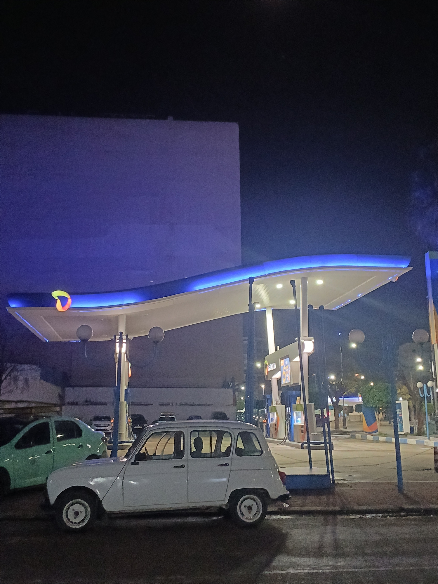 This nighttime image captures a TotalEnergies gas station located on Boulevard Al Massira Al Khadra, Meknes, Morocco. The station features a distinctive, wavy white canopy illuminated by bright blue L…read more
