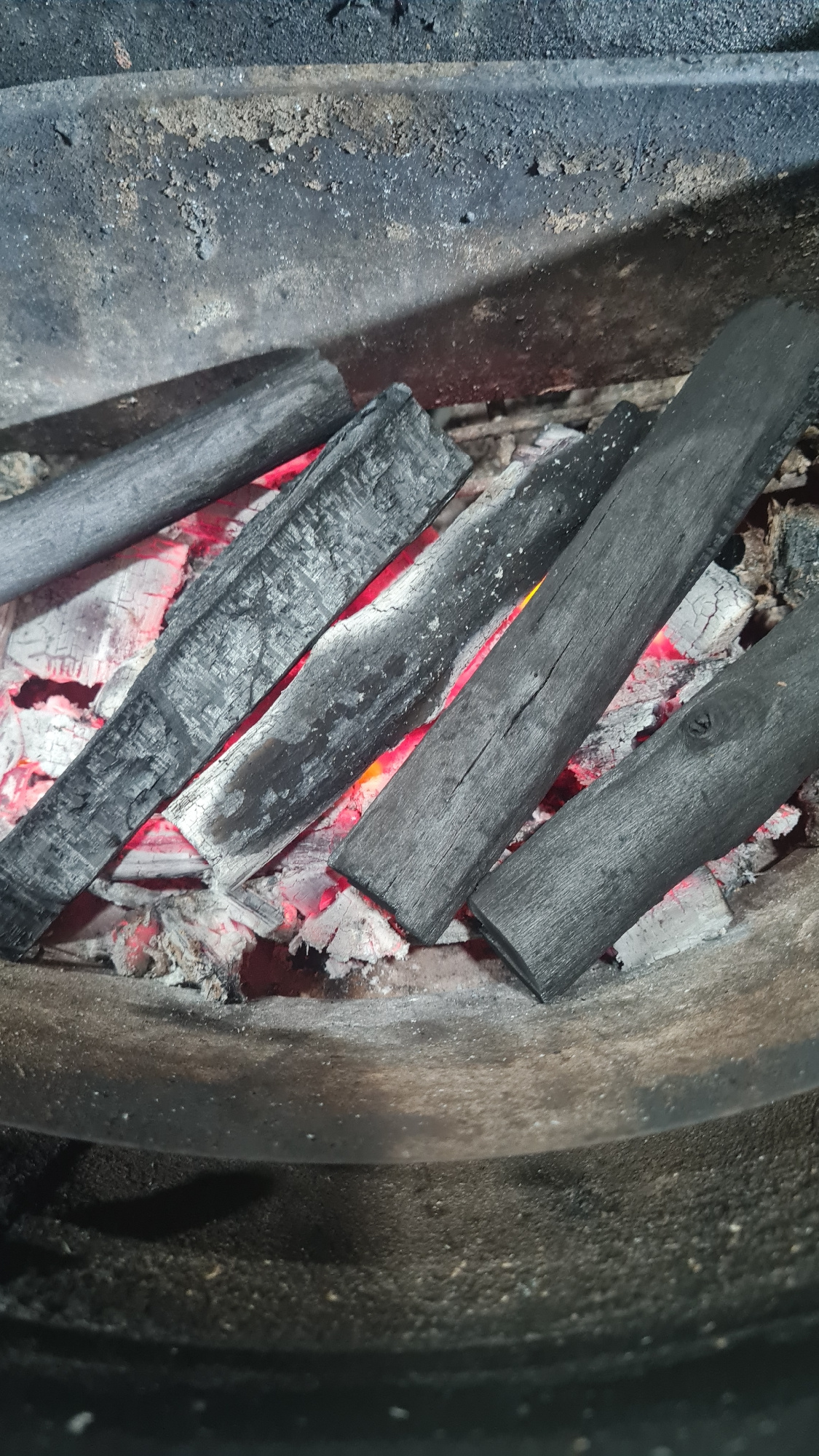 The image depicts charred wooden logs burning inside a dark, cylindrical container, possibly a barbecue grill or fireplace. Embers glow red beneath the logs, surrounded by gray ash. The container's inβ¦read more
