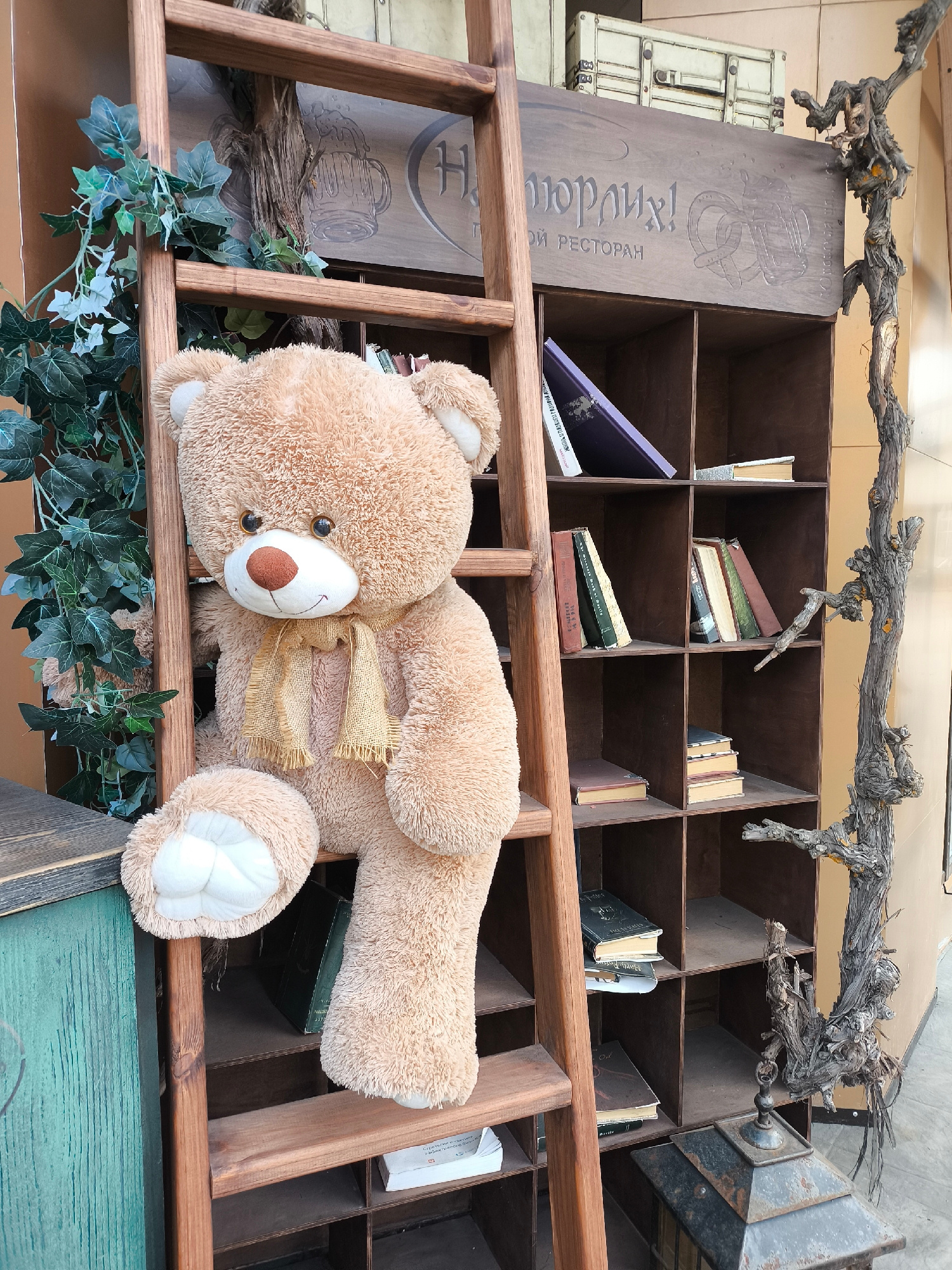 An indoor display features a large, plush, light-brown teddy bear with a small scarf tied around its neck, sitting on a wooden ladder. The ladder leans against a dark wooden bookshelf with several com…read more