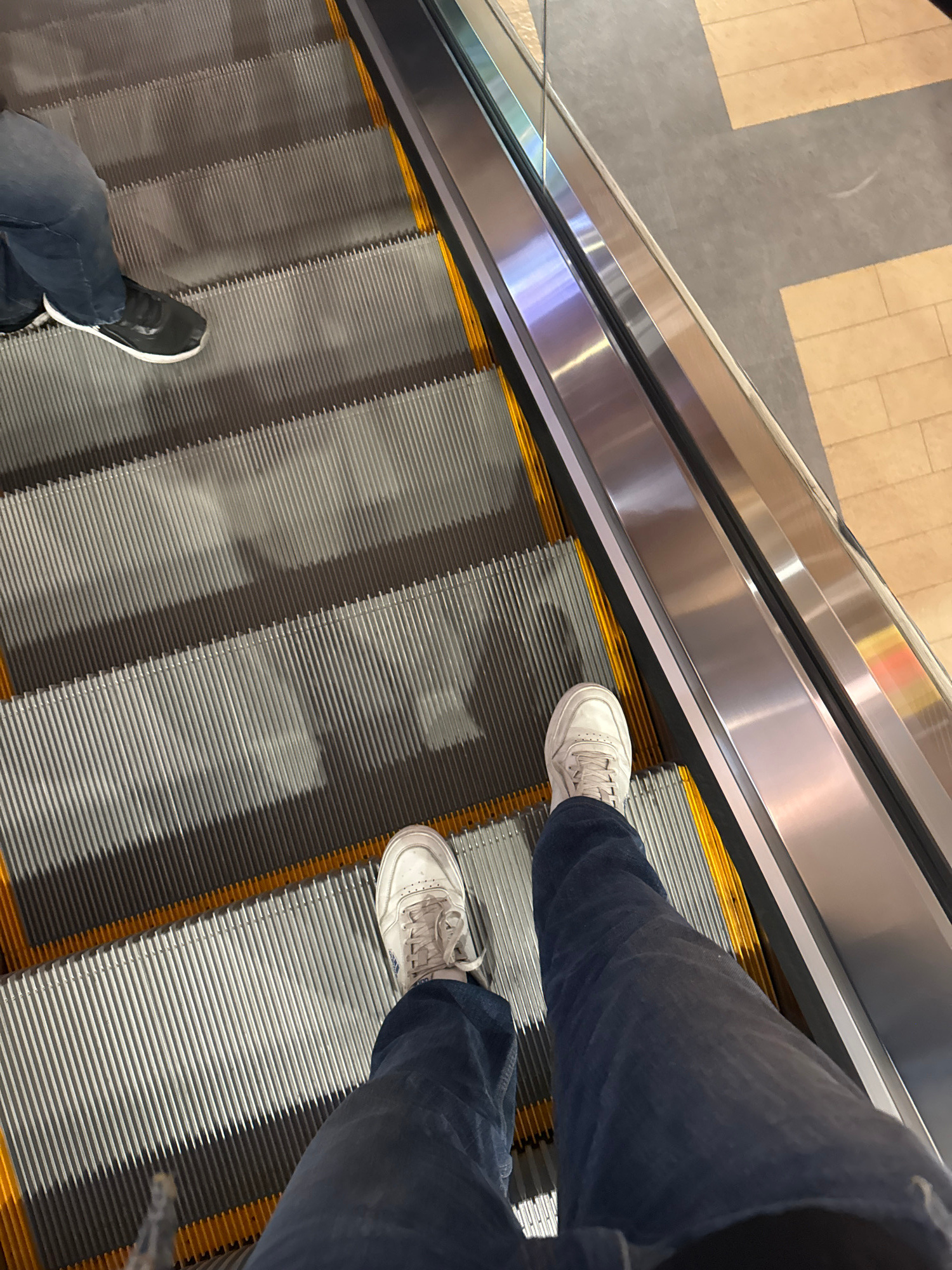 The image shows a view from above looking down on an escalator with two people riding it. The escalator has a metallic silver frame with yellow borders along the edges of the moving steps. One person…read more