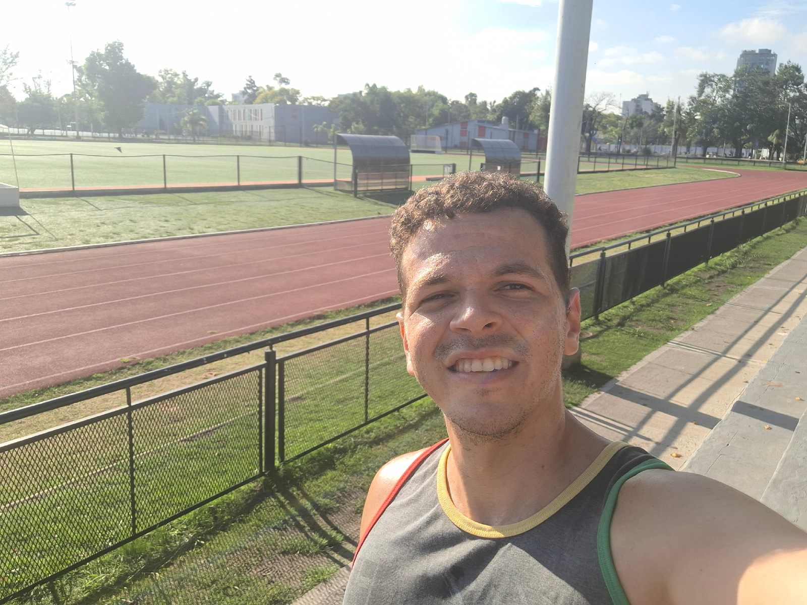 A selfie captures a man at the Villa Domínico Athletics Stadium, Argentina. He stands on the stadium's upper seating, as indicated by the visible concrete steps to his right. A black metal railing sep…read more