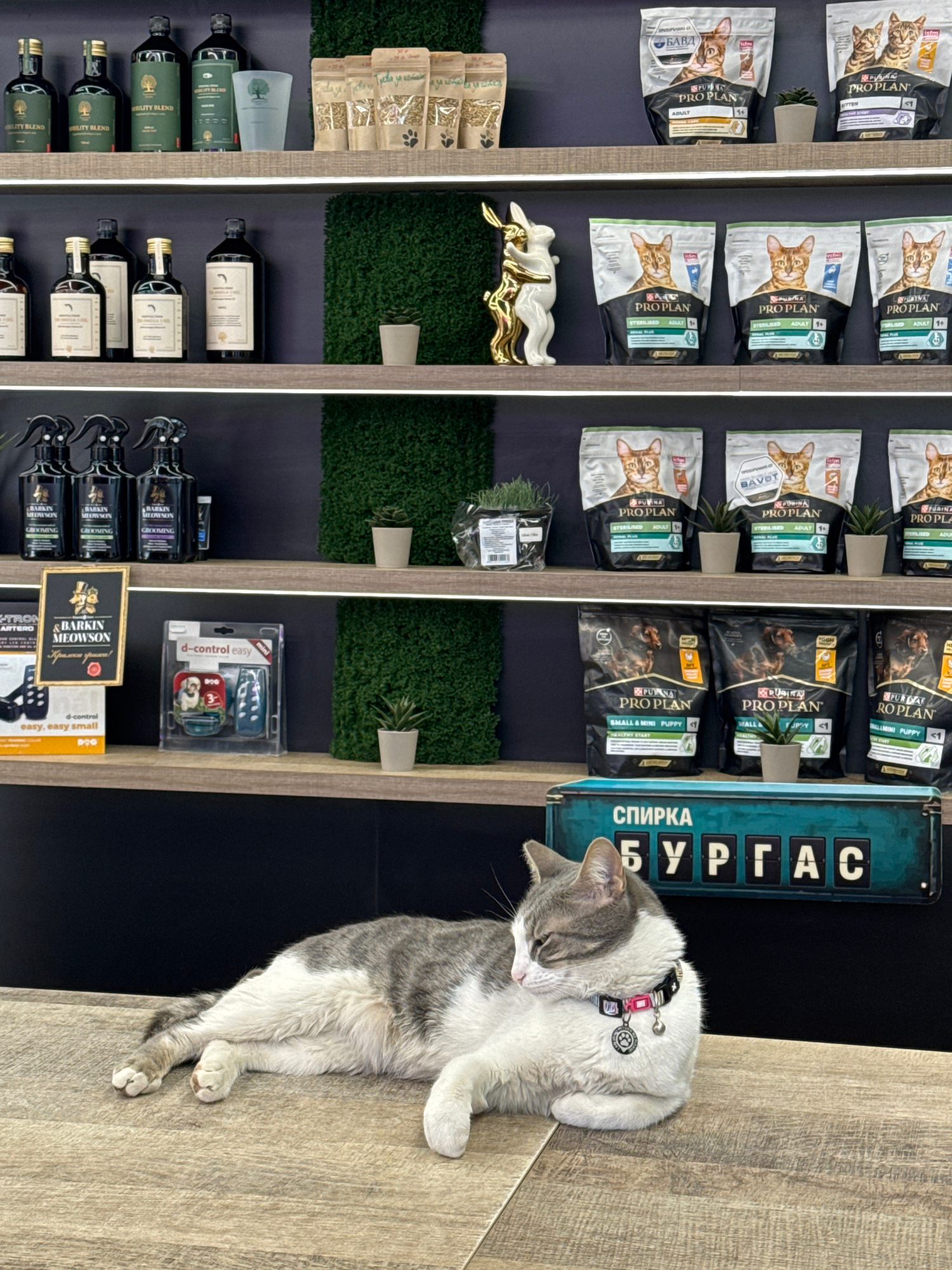A photograph taken in a pet shop in Burgas, Bulgaria. The shot is a medium, close-up shot focused on shelves of pet supplies. On the leftmost shelves are bottles labeled "BILITY BLEND", followed by bags of dry cat food (Purina Pro Plan) and puppy food, with "СПИРКА БУРГАС" appearing vertically on a repurposed bus stop sign, on the right side. A gray and white cat with a collar lies on a wooden surface to the right of the bus stop sign. The shelves also include small decorative plants and golden rabbit figurines, grooming products labeled "BARKIN MEOWSON", and electronic pet training devices labeled "d-control easy". | Open Wire