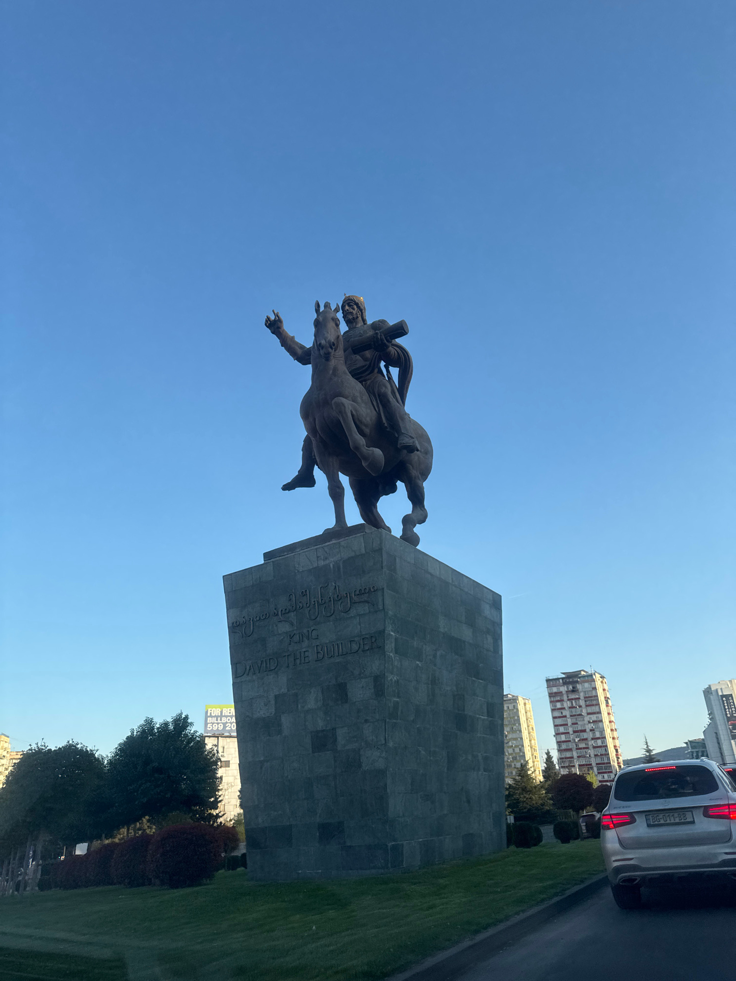 An equestrian statue of King David the Builder, depicted on horseback with an outstretched arm, stands prominently on a large, dark gray stone pedestal. The monument is set against a clear, bright blu…read more