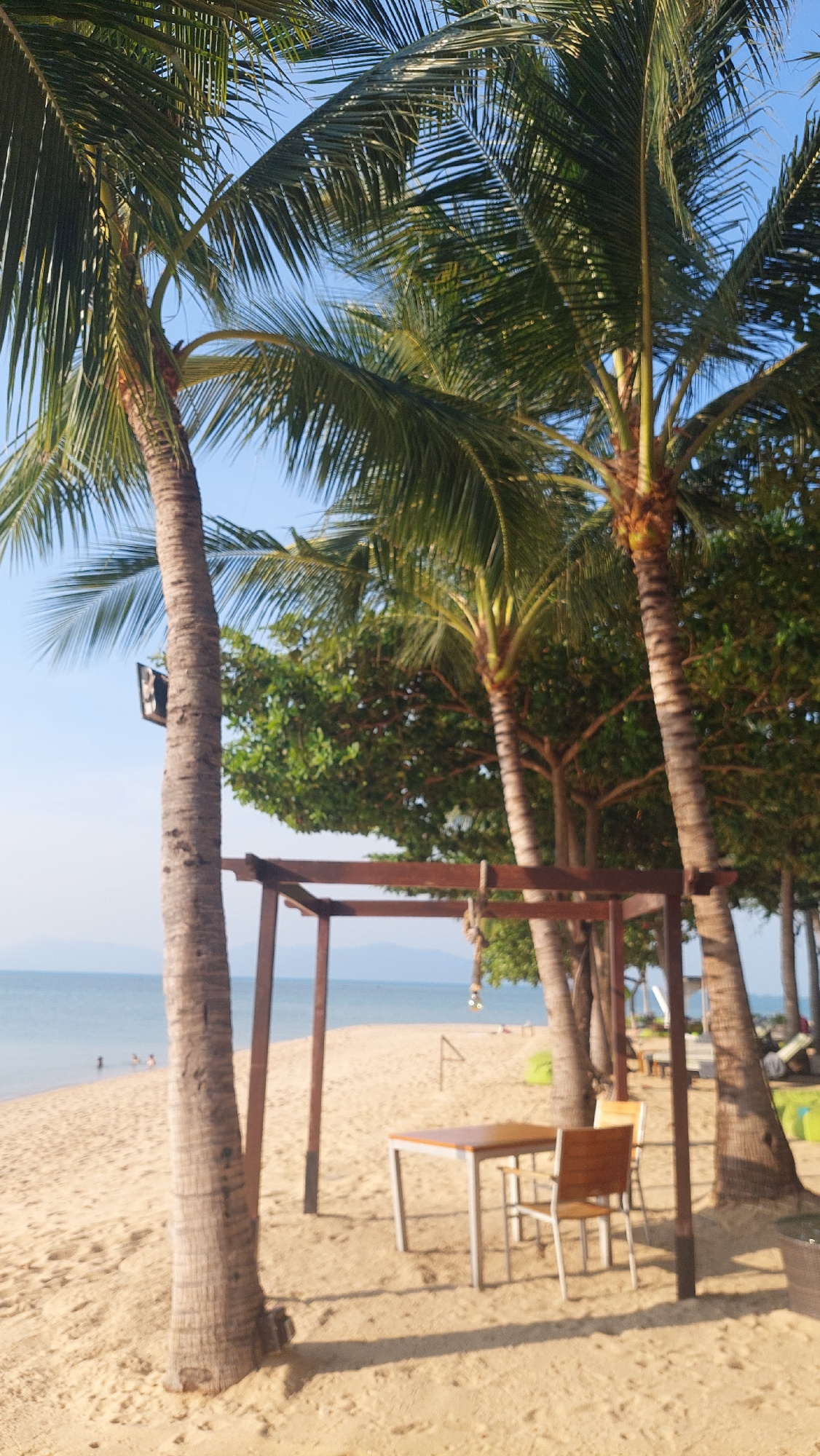 The image depicts a beach scene in Baan Bo Phut, Thailand. Palm trees with green fronds dominate the left side of the frame, contrasting with the clear blue sky. A wooden structure, possibly part of a…read more