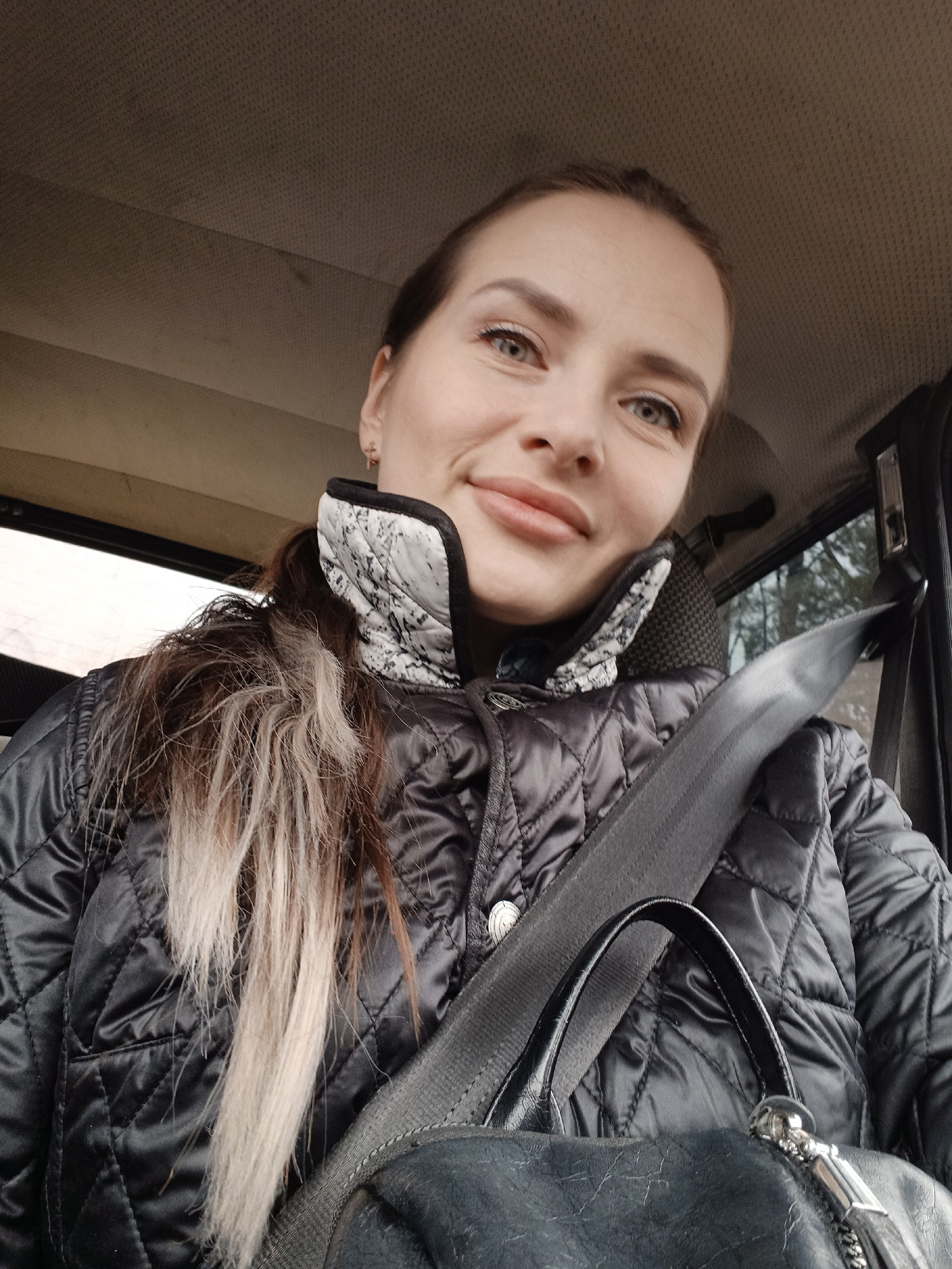 A woman is inside a vehicle, likely a car, wearing a black quilted jacket with a white and black patterned collar. She is wearing a seatbelt. Part of a black bag with a silver zipper pull is visible.…read more