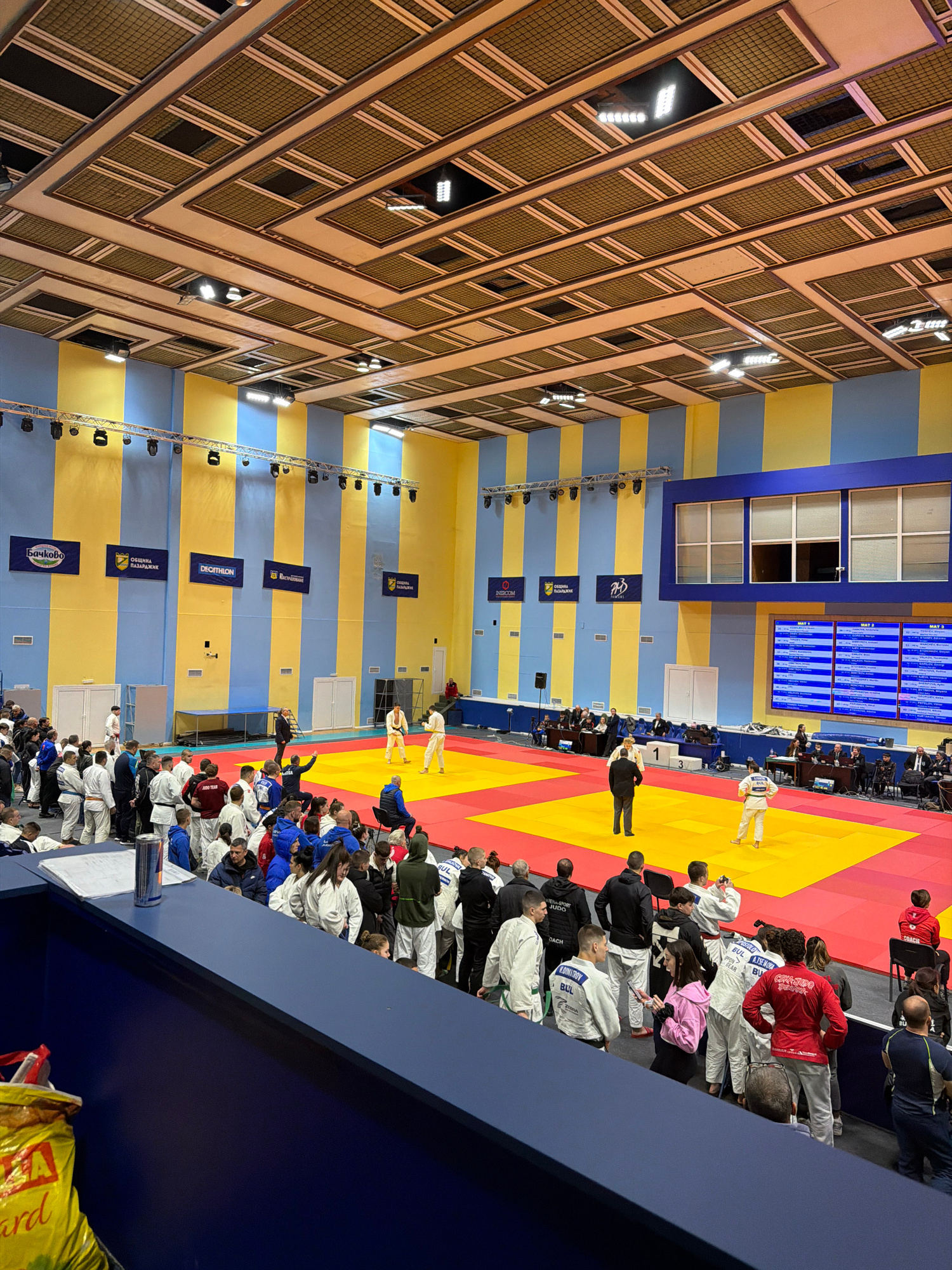 A vertically oriented, medium shot taken indoors shows a judo competition at an undetermined location in Pazardzhik, Bulgaria. The focus is on the competition area where two judokas are engaged in a m…read more