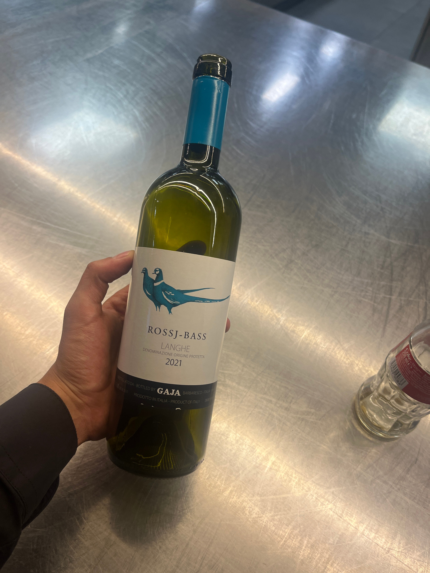 A person's hand holds a wine bottle horizontally over a reflective, scratched metallic surface. The wine bottle is made of green glass with a prominent white label. The label features an illustration…read more