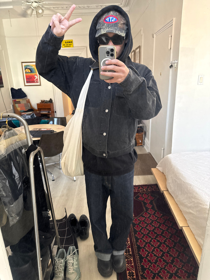 A full-body mirror selfie captures an adult individual standing within a residential interior in New York, United States of America. The subject is dressed in a dark, possibly charcoal-colored, hoodedβ¦read more
