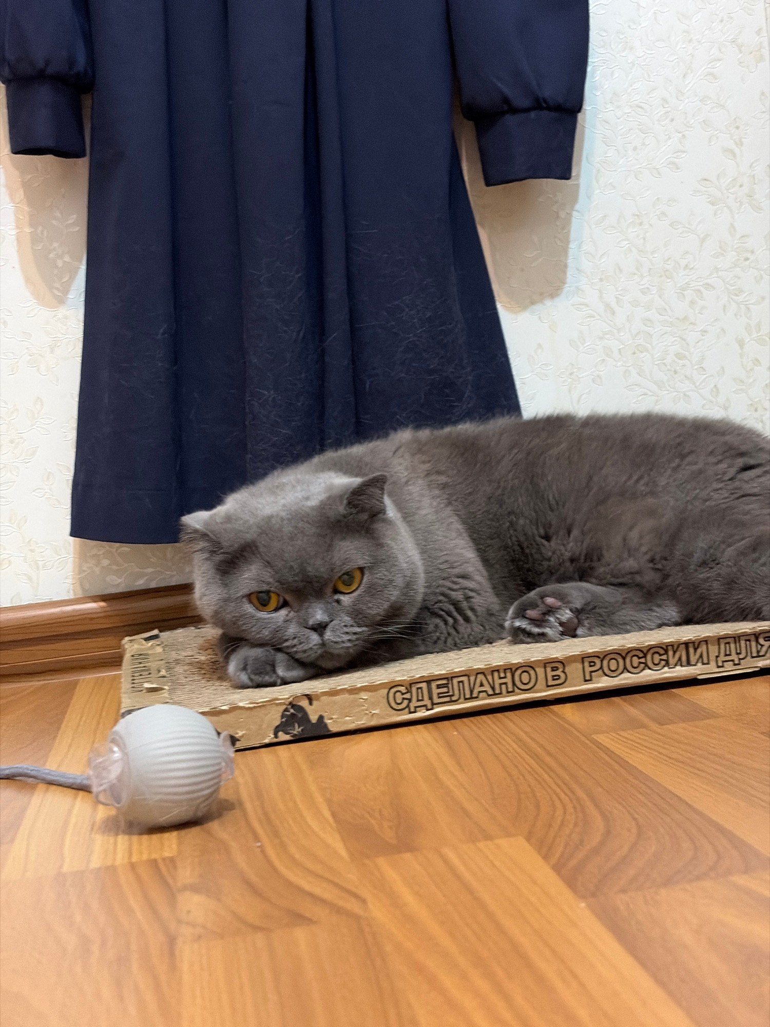A gray Scottish Fold cat is perched on its back within a cardboard scratching box. The box has the inscription "Made in Russia," rendered vertically. The cat has yellow eyes, with one paw on the side…read more