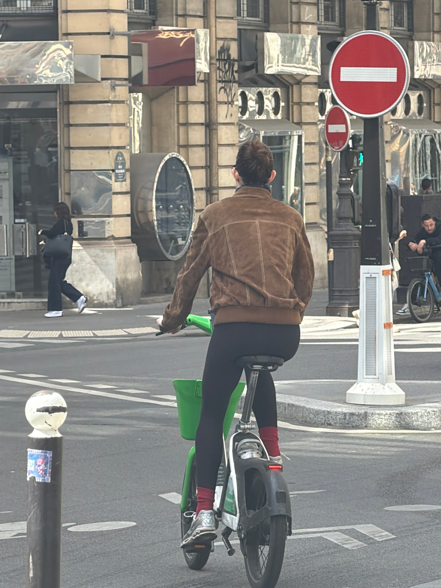 An urban street scene, likely in Paris, France, is depicted during daytime under clear, bright conditions. The central focus is a person riding a bicycle, viewed from behind as they move across the fr…read more