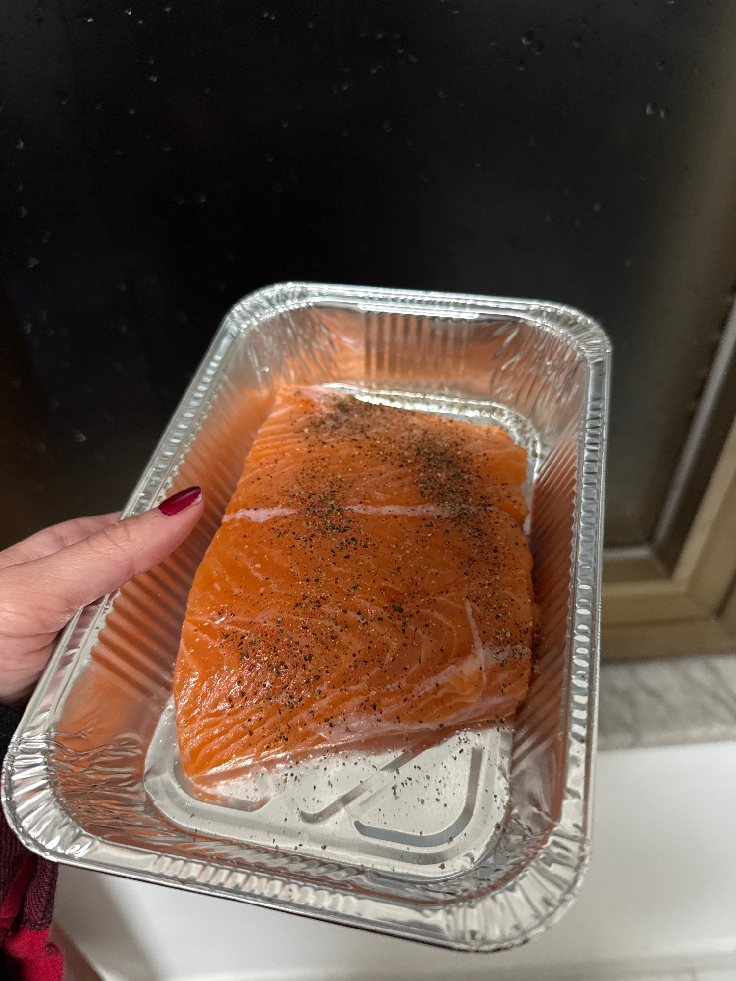 This image, captured indoors in Ercolano, Italy, depicts a raw salmon fillet positioned within a rectangular aluminum foil baking pan. The salmon is bright orange-pink and is seasoned with scattered b…read more