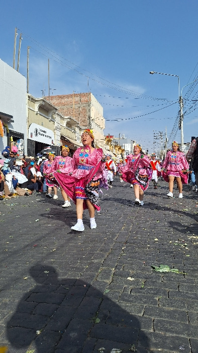 A street scene depicts a group of women performing a dance, possibly in a parade. They wear bright pink dresses with floral designs and white athletic shoes. The street is paved with dark brick. Build…read more