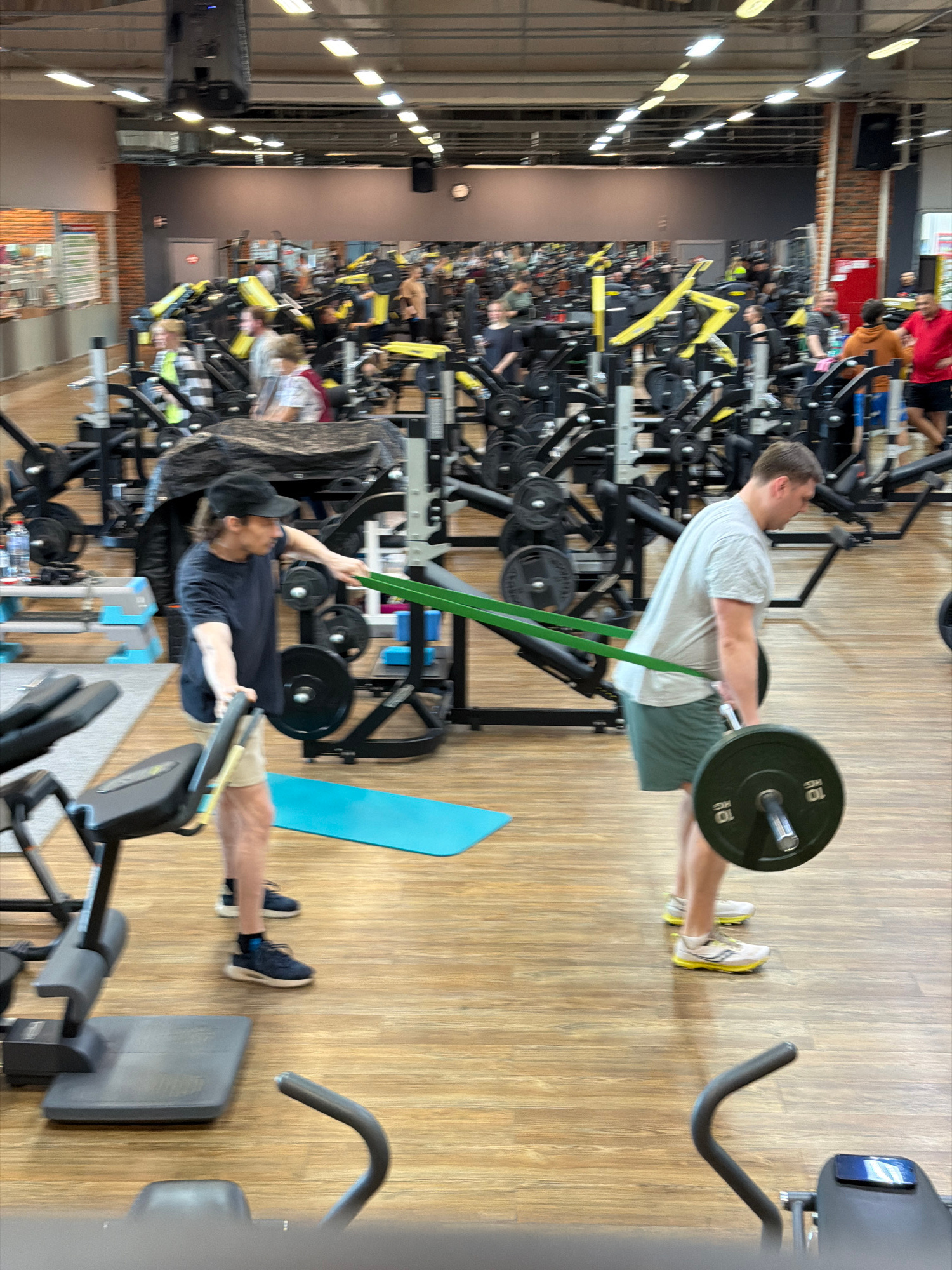 The image shows the interior of a gym, crowded with exercise equipment and people working out. Two men are prominently featured: one lifting weights using a resistance band, and the other performing a…read more