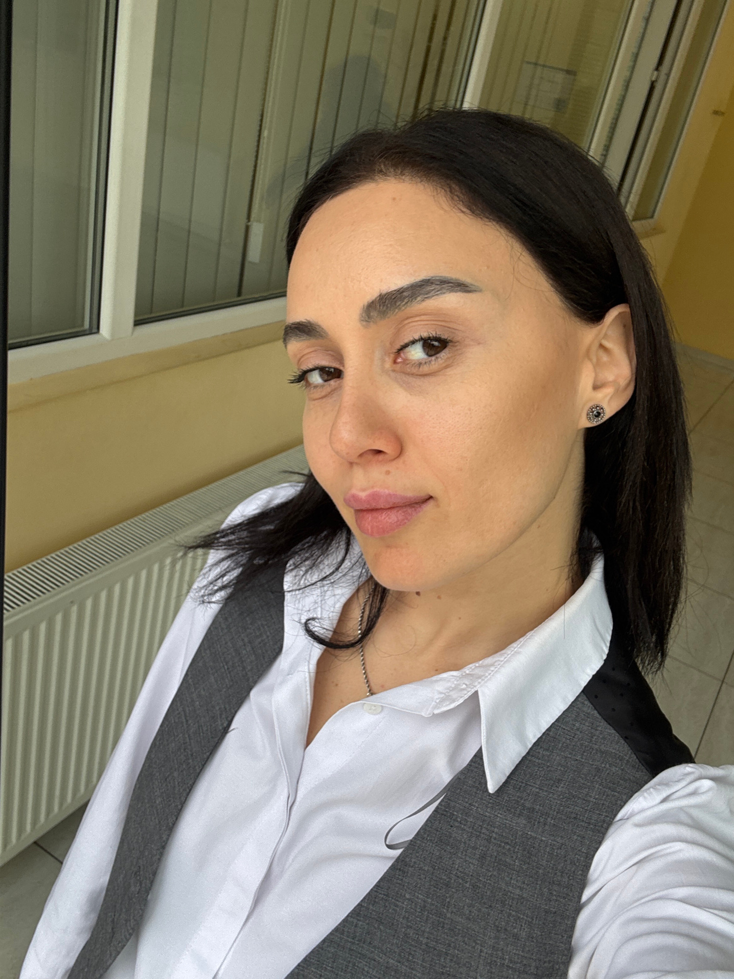 A medium shot features a woman with dark hair, styled straight, and defined eyebrows. She is wearing a white button-down shirt with a dark grey vest. A thin silver necklace is visible around her neck.…read more