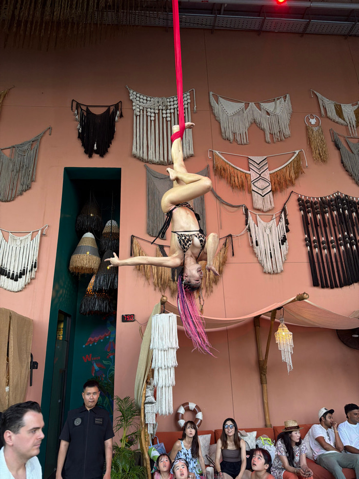 A female aerialist, wearing a leopard print two-piece swimsuit and sporting long pink and purple braids, is suspended upside down from a red silk fabric, with her right ankle secured by the silk. Her…read more