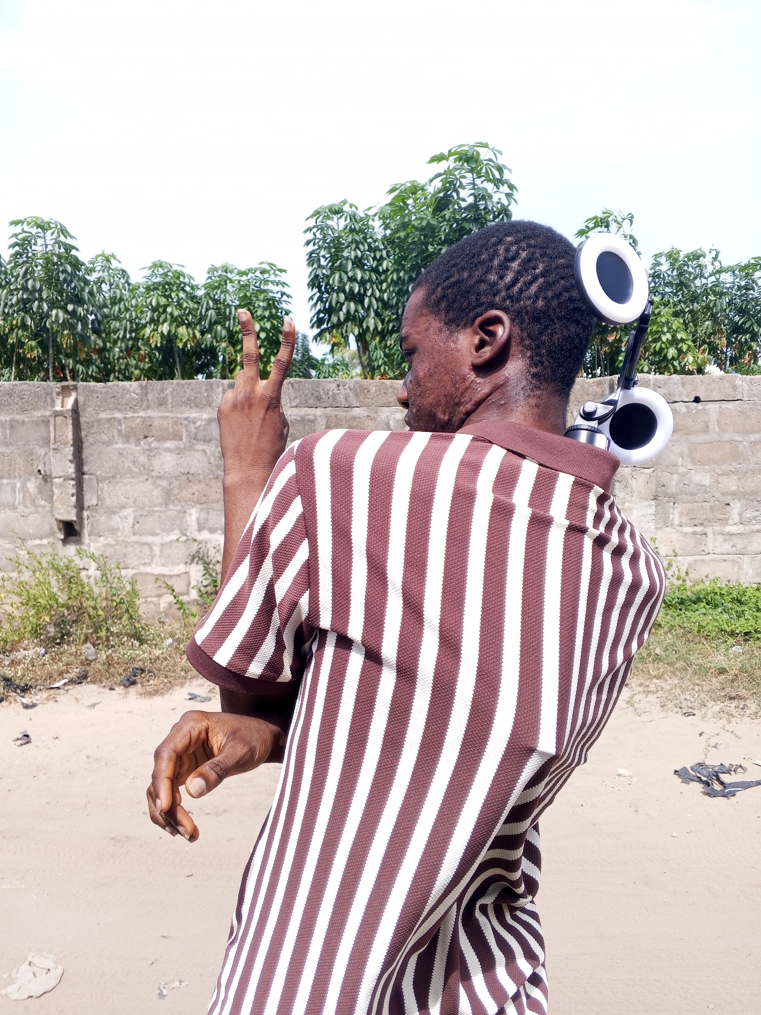 The image shows a man standing on a sandy surface in what appears to be an outdoor environment in Badagry, Nigeria. He is wearing a brown and white striped shirt, and his back is to the camera. Over his shoulders, there is a piece of equipment with white circular elements that resemble headphones. He is making a peace sign with his right hand. In the background, there is a wall, green vegetation, and a clear sky. The overall scene seems to be captured during daylight hours. | Open Wire