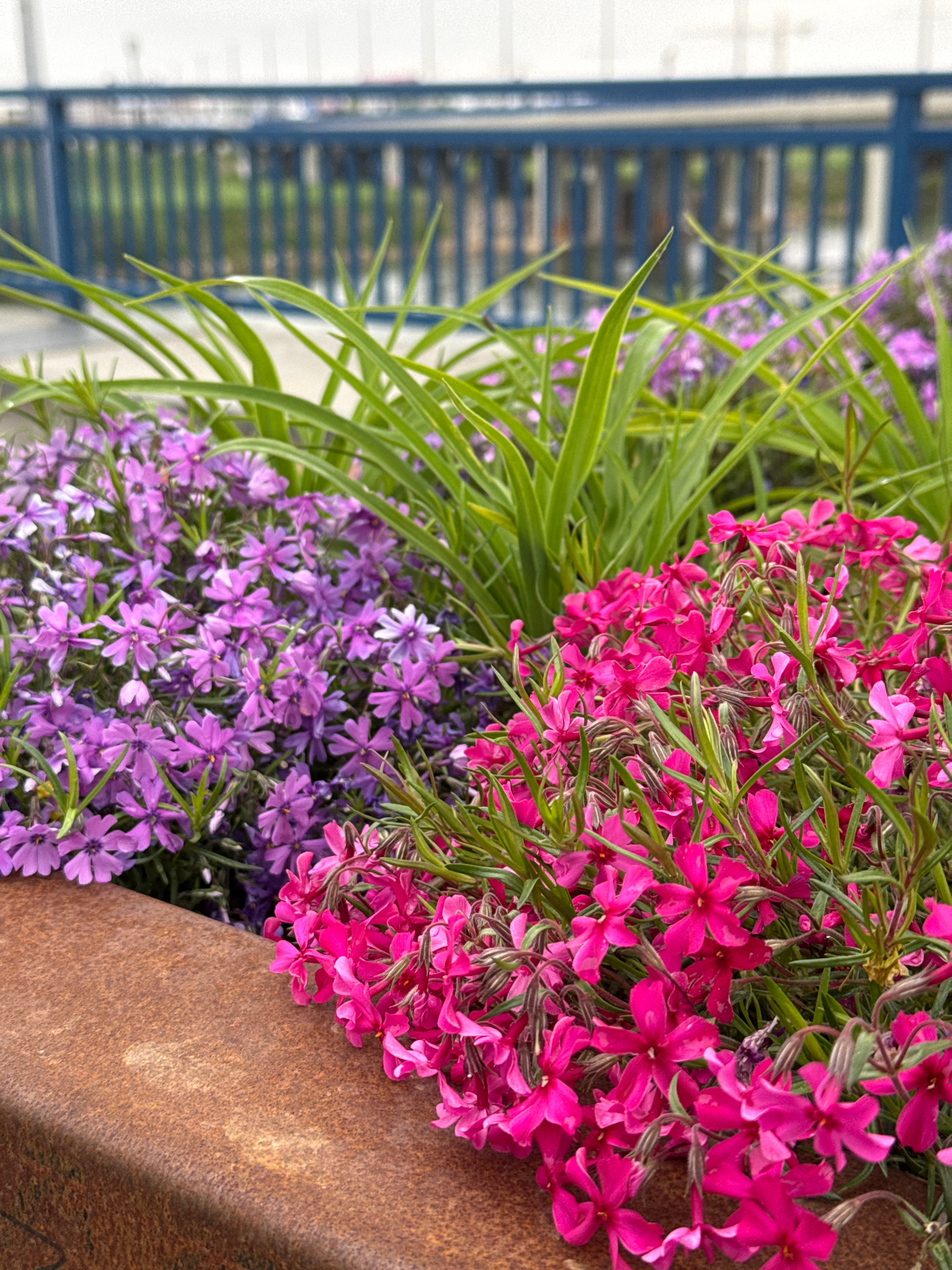A close-up, slightly low-angle shot features a rusted metal planter filled with vibrant pink and purple phlox flowers. The flowers are densely clustered, creating a colorful floral arrangement. Green,…read more