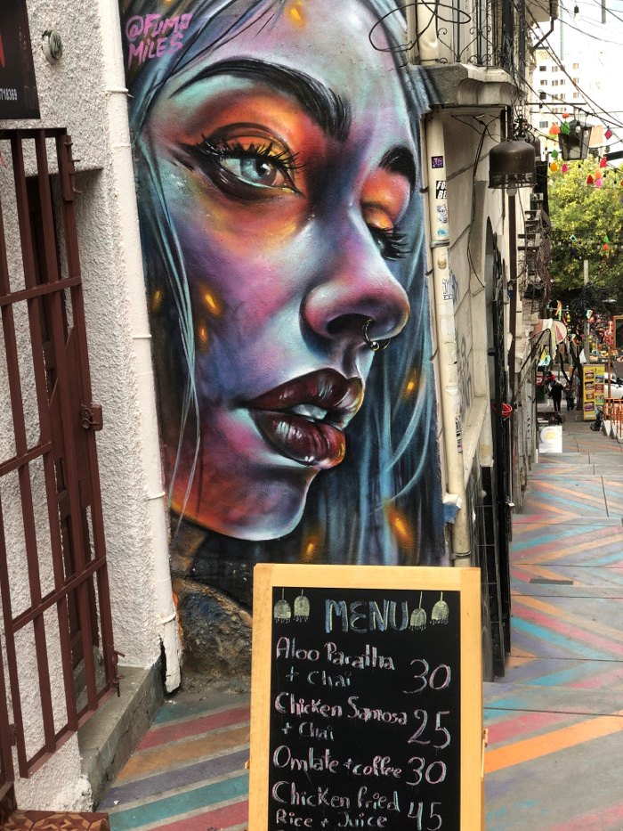 The image showcases a vibrant street art mural depicting a woman's face in profile with striking colors and intricate details, including a nose ring. A menu board lists "Aloo Paratha + Chai" for 30, "…read more
