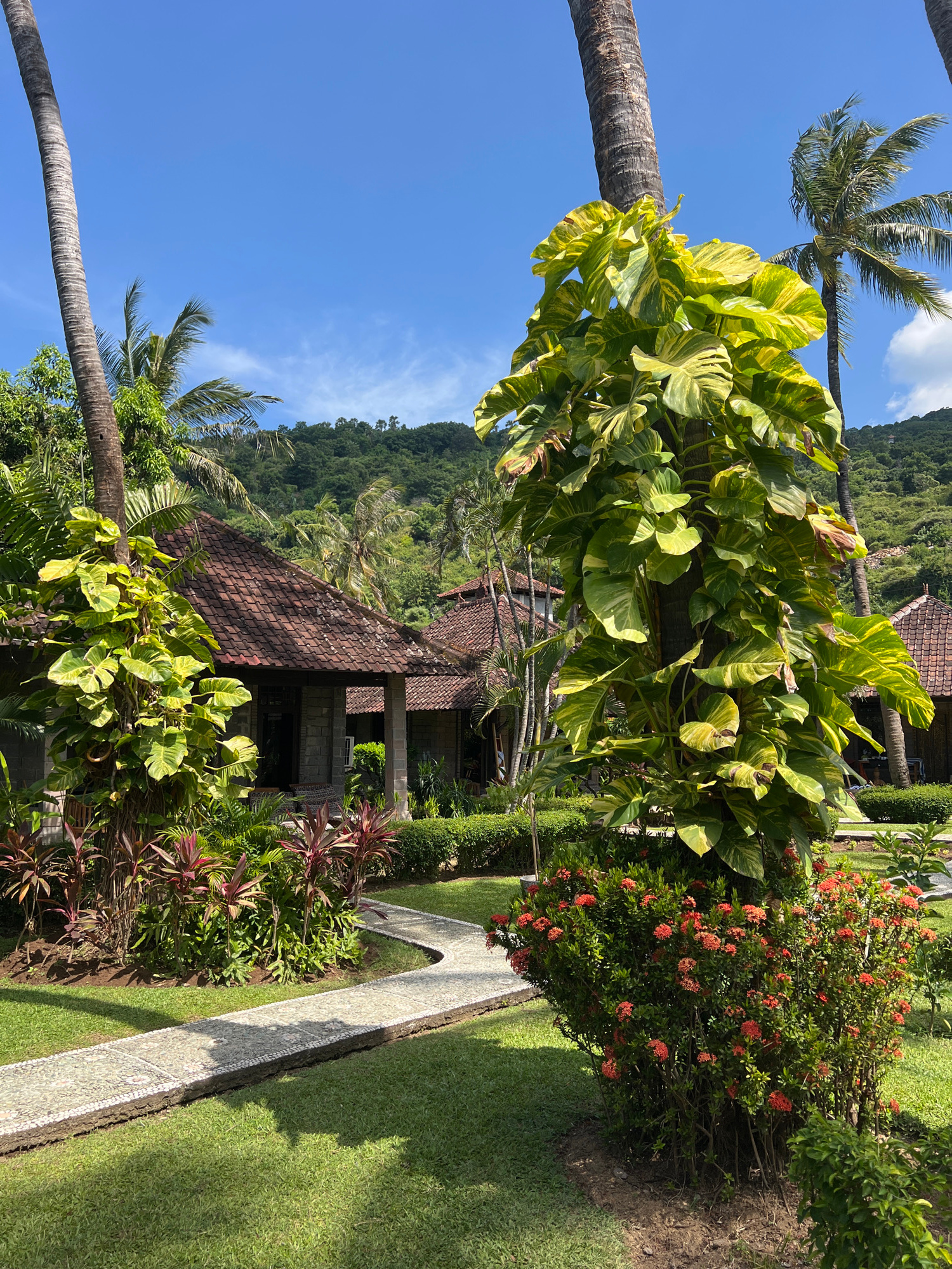 This is an outdoor scene in Abang, Indonesia, capturing a building with a terracotta tile roof nestled among lush greenery and palm trees. A walkway constructed of small stones winds through a well-ma…read more