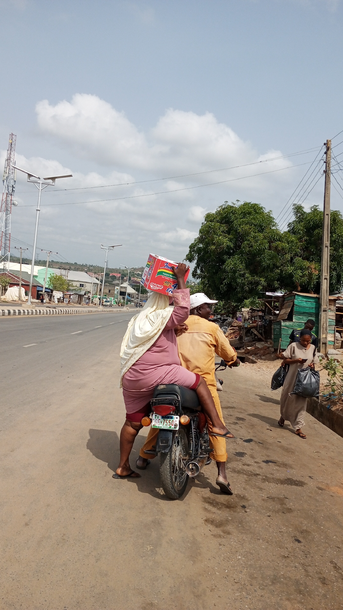 A woman in a pink dress and white headscarf sits sidesaddle on a motorcycle, holding a box of Indomie noodles on her head. The motorcycle is ridden by a man in an orange outfit. They are on a paved ro…read more