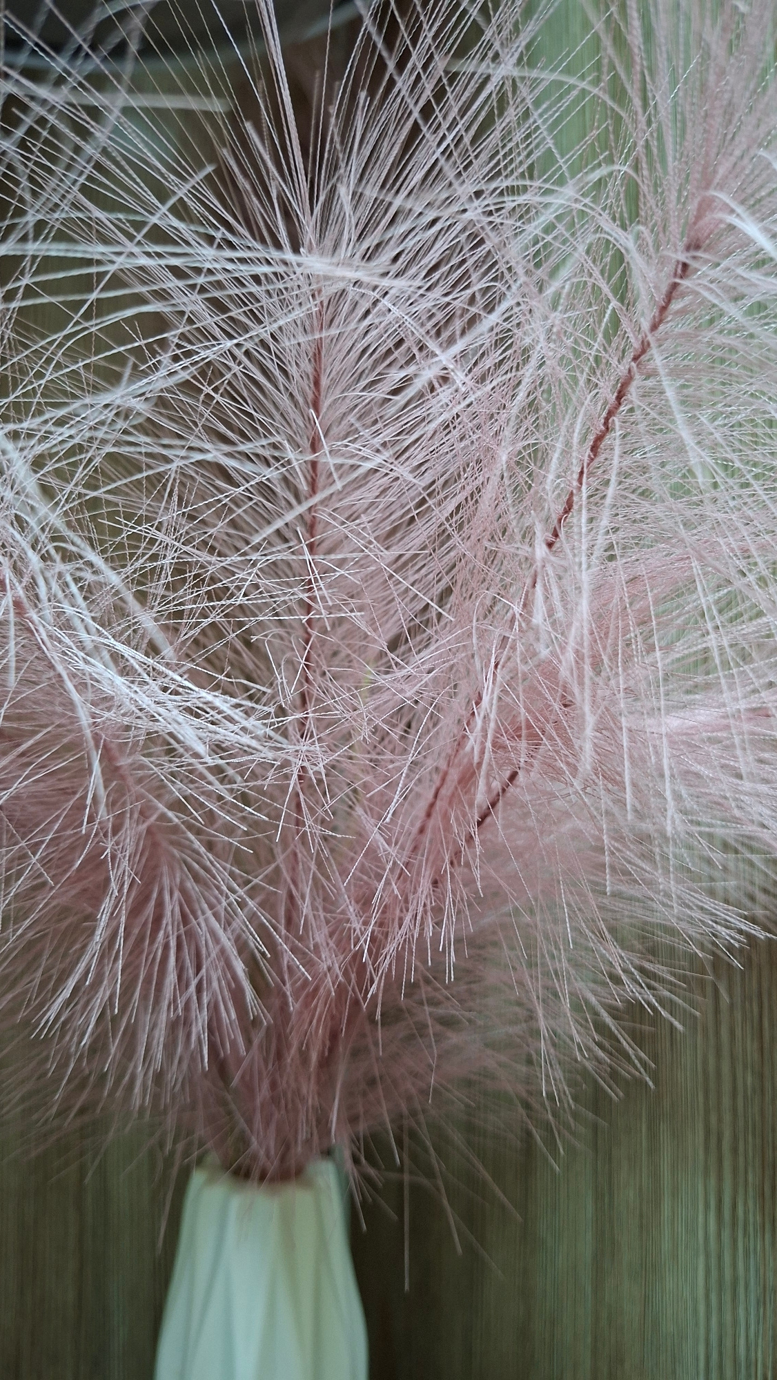 The image shows a close-up view of ornamental plumes, likely pampas grass or a similar species, with a pinkish-white hue. The plumes have a feathery texture and are densely packed. A portion of a vase…read more