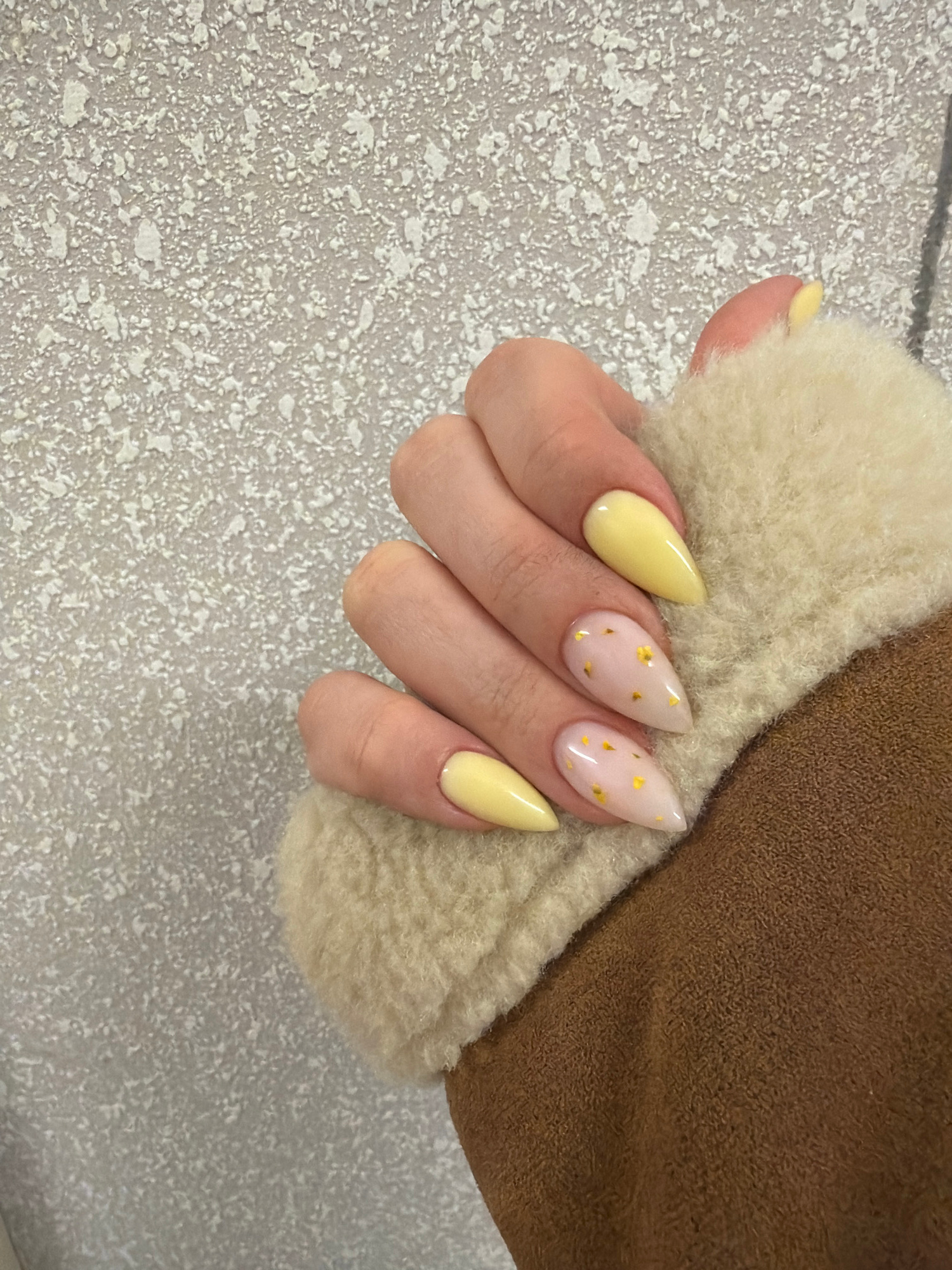 The image shows a woman's hand adorned with almond-shaped nails. Two nails are painted a solid pastel yellow, while the middle two have a translucent base with scattered gold flecks. The hand is posit…read more