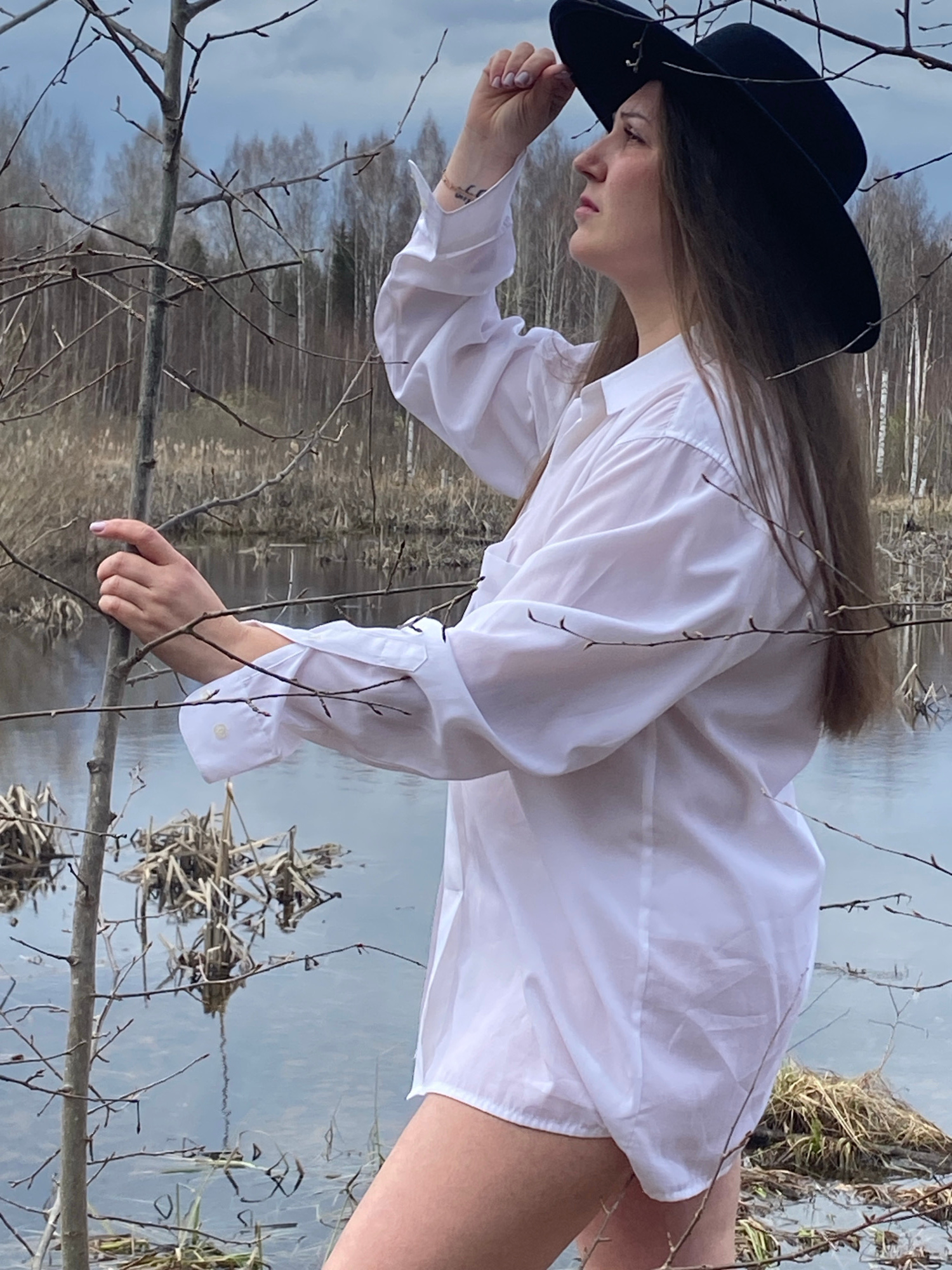 A woman stands near a body of water in what appears to be a natural environment. She is wearing a white, long-sleeved shirt and a black hat. Her body is angled diagonally in the frame, with her left h…read more