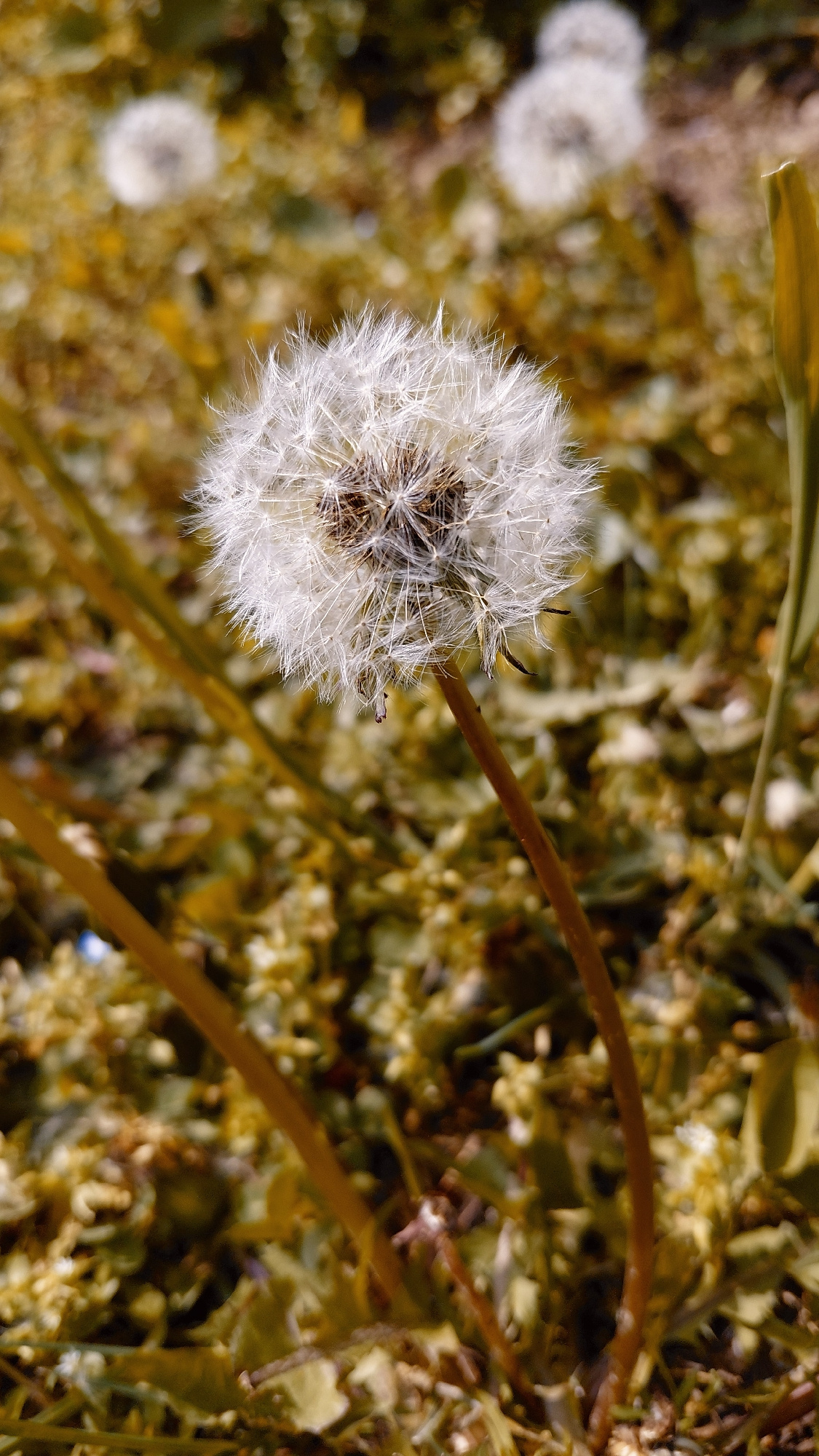 This close-up photograph captures a fully mature dandelion seed head, often called a blowball, in sharp focus. The fluffy white sphere, composed of numerous delicate pappi (parachutes), is prominently…read more